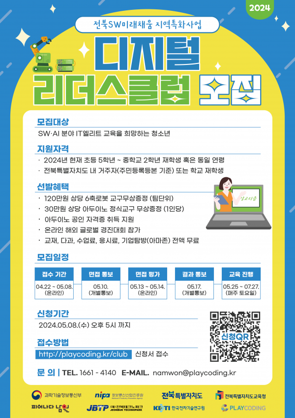[교육=뉴전북] 전북특별자치도는 5월 8일까지 미래 소프트웨어(SW) 인재 양성을 위해 ‘디지털 리더스 클럽’ 청소년 교육생을 모집한다고 밝혔다.