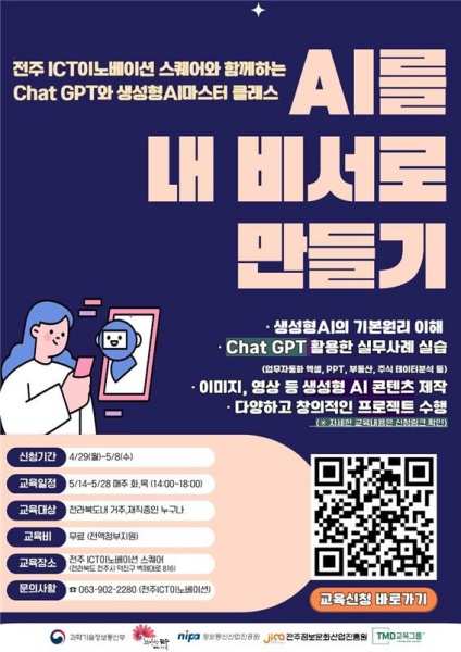 [교육=뉴전북] 전주시와 (재)전주정보문화산업진흥원(원장 이영로)은 오는 8일까지 J-디지털교육관리시스템을 통해 ‘Chat GPT와 생성형 AI 마스터 클래스’ 과정에 참여할 교육생을 모집한다고 3일 밝혔다.