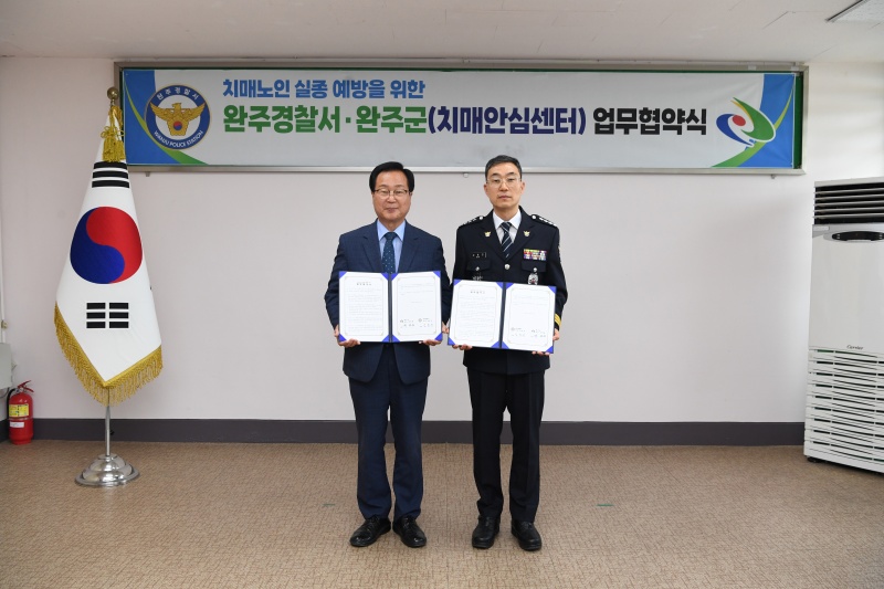 [완주=뉴전북] 완주군(군수 유희태)과 완주경찰서(서장 김효진)가 치매어르신이 안전한 완주를 위해 손을 맞잡았다.