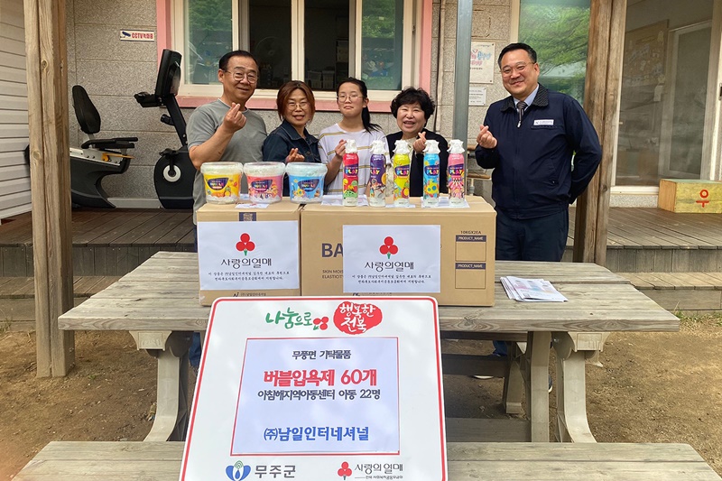 [무주=뉴전북] 가정의 달 이웃을 생각하는 마음들로 무주군이 훈훈하다. 무주군에 따르면 무풍면 ㈜남일인터네셔널(무풍면 소재, 천연목욕소금, 거품목욕제 생산 등 입욕제 전문기업)은 어린이 날을 기념해 무풍면 아침해지역아동센터 이용 아동 22명에게 이스라엘 사해소금이 함유된 플레이 버블클렌저를 선물했다.