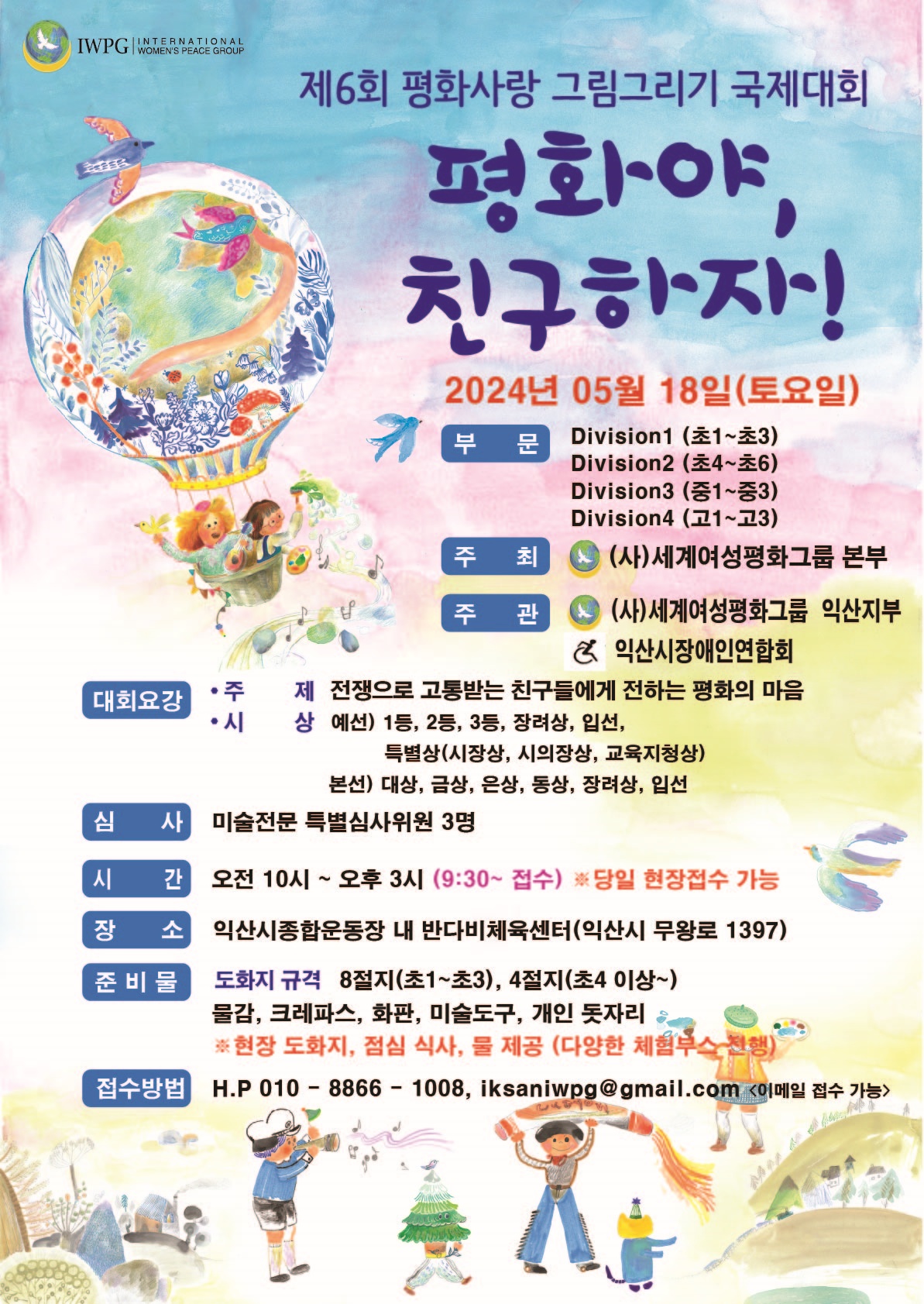 전영선 IWPG 익산지부장은 “대회에 참가하는 어린이와 청소년들이 전쟁으로 고통받는 친구들에게 평화의 마음을 그림으로 전하는 뜻깊은 시간이 되었으면 좋겠다”며 “우리 아이들의 미래에는 전쟁은 없어지고 평화와 행복만이 가득하길 바란다”고 전했다.