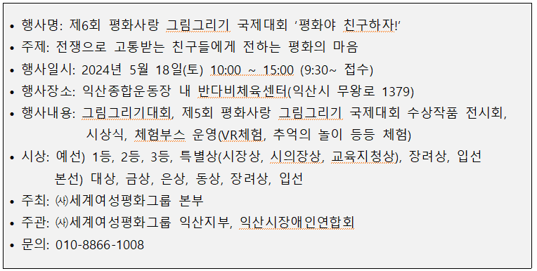 [문화=뉴전북] ㈔세계여성평화그룹 익산지부(IWPG, 지부장 전영선)가 익산시장애인연합회(대표 정병현)와 함께 오는 5월 18일 오전 10시 익산종합운동장 내 반다비체육센터에서 ‘제6회 평화사랑 그림그리기 국제대회’ 예선을 개최한다.