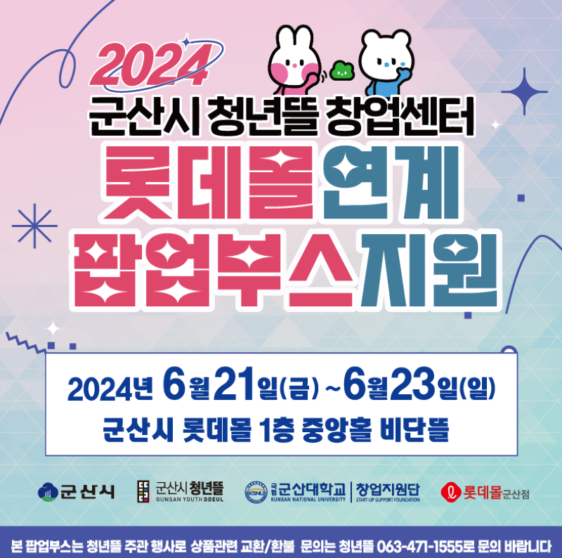 [군산=뉴전북] 군산시 청년뜰 창업센터(이하 창업센터)는 롯데몰 군산점 1층 중앙홀(비단뜰)에서 지역 창업가의 제품 홍보와 판로개척을 위한 ‘롯데몰 연계 팝업부스 지원’ 행사를 오는 6월 21일(금)부터 23일(일)까지 3일간 진행한다.