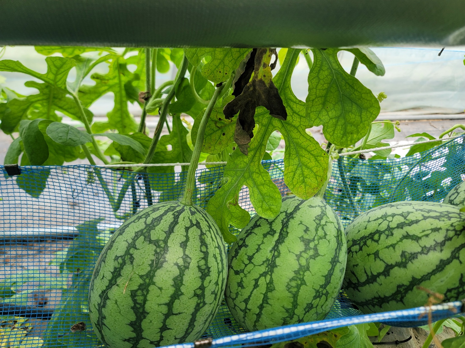 수박 재배의 장점은 기존 딸기 양액재배 시설을 활용하고 수박(중소형)이 자라면 그물망을 설치하여 수박을 안전하게 고정함으로 경영비가 크게 절감된다.