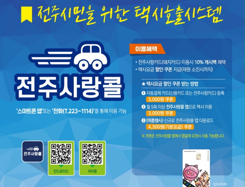먼저 7월과 8월 중 전주사랑콜 앱을 처음으로 설치한 고객에게는 4300원의 기본요금 할인 쿠폰이 제공된다.