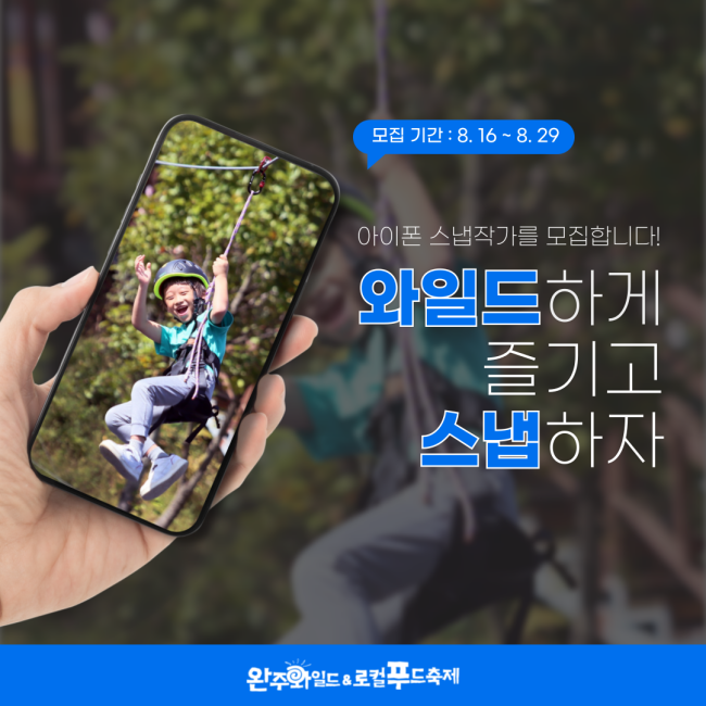 19일 완주군에 따르면 영상 촬영 서포터즈단은 10월 4일부터 6일까지 고산자연휴양림 일원에서 열리는 제12회 완주 와일드앤로컬푸드축제 기간 동안 지정된 장소에서 자신만의 감성으로 스냅촬영을 하게 되는 역할을 맡게 된다,