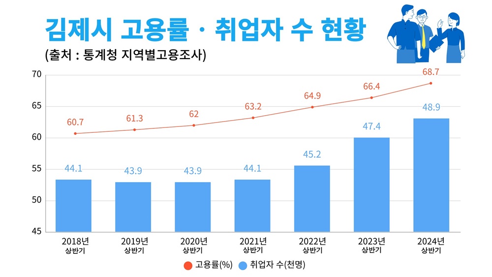 29일 시에 따르면 지난 20일 통계청이 발표한「2024년 상반기 지역별 고용조사 주요 고용지표」에서 김제시 고용률은 68.7%로 전국 평균 63%와 전북 평균 64.4%를 모두 상회하는 높은 수치를 기록했다. 또한 취업자 수도 전년 대비 1,500명이 증가한 48,900명으로 집계됐으며, 실업률은 전년동기 대비 0.9%p 감소한 2.1%로 나타났다.