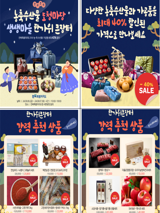 전북자치도는 비단 한가위 큰장터 오프라인 행사에 그치지 않고, 전북생생장터(www.freshjb.com) 온라인 장터를 통해서도 한가위 프로모션을 병행할 계획이다.