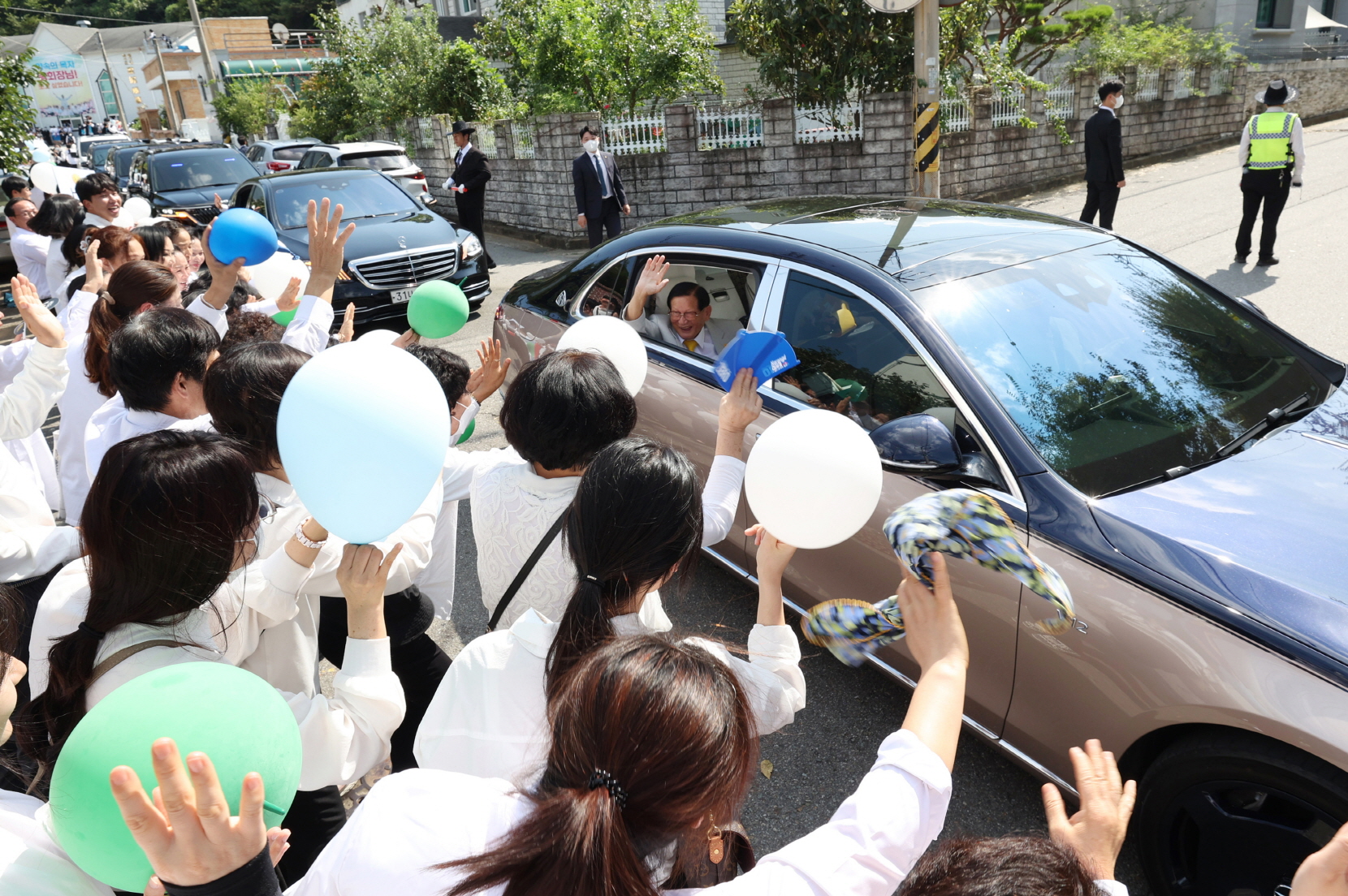 지난 6월 30일 전남 순천 신천지 순천교회에 방문을 마친 이만희 총회장을 환송하기 위해 나온 교인들의 모습.
