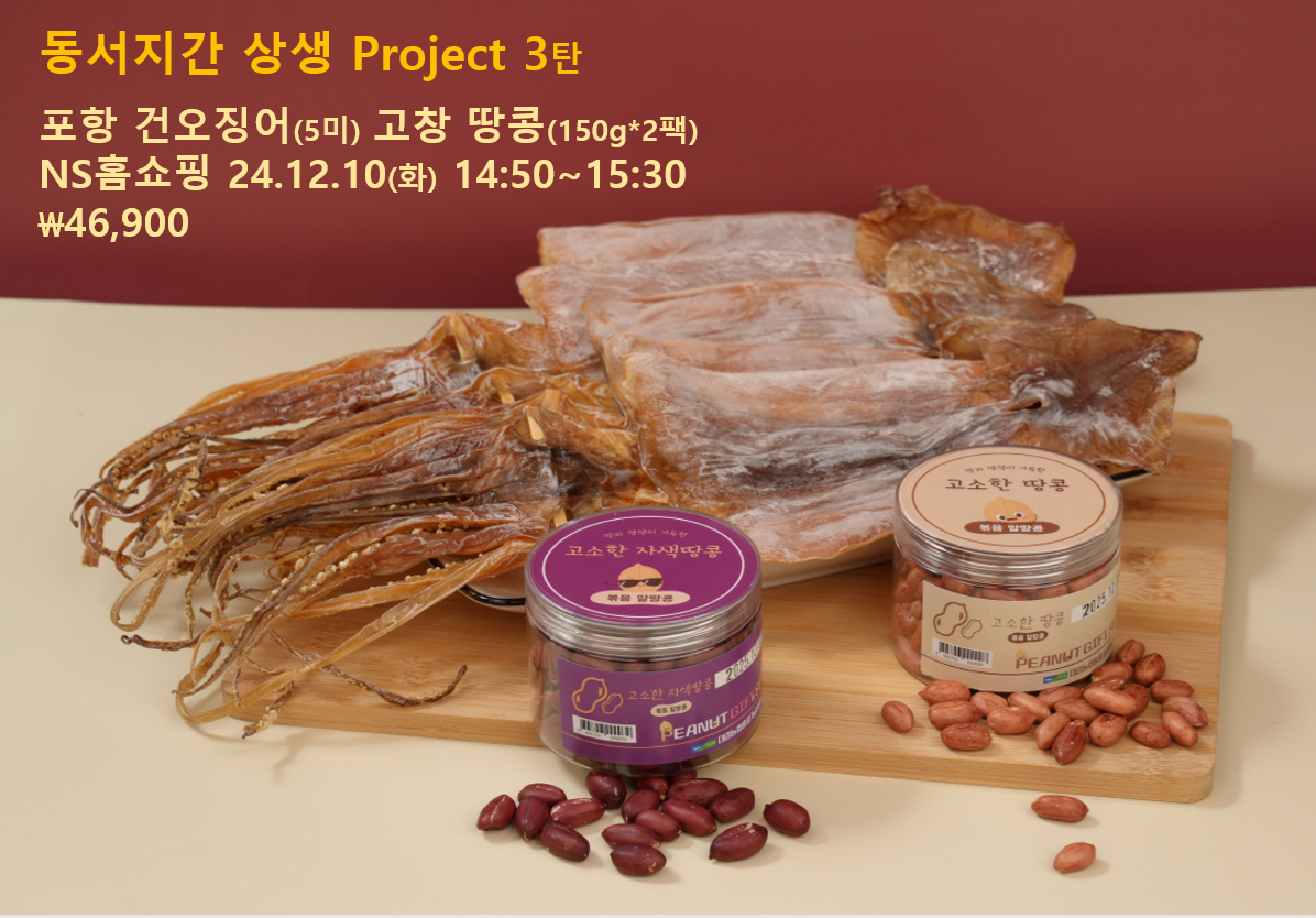 [고창=뉴전북] 전북 고창군과 경북 포항시가 ‘동서지간 프로젝트 3탄’으로 10일 오후 2시50분 부터 3시30분까지 NS홈쇼핑에서 ‘고창 땅콩과 포항 건오징어 세트’ 판매 방송을 진행한다.