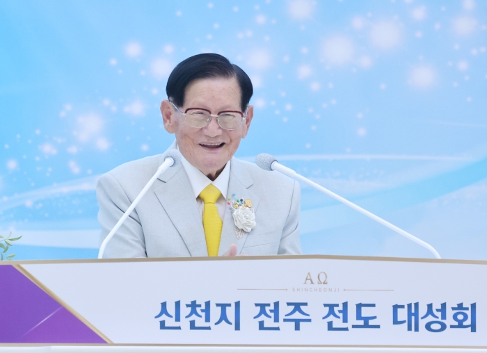지난 10월 13일 신천지예수교회 이만희 총회장이 신천지 전주교회에서 열린 신천지 전주 전도 대성회에서 강연하고 있다.