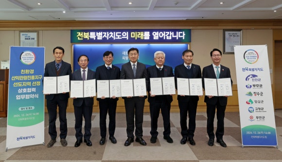 친환경 산악관광진흥지구 선도지역 선정과 관련하여 전북자치도와 선정된 6개 군(임실, 무주, 장수, 고창, 진안, 부안)이 지난 26일 업무 협약식을 가졌다.