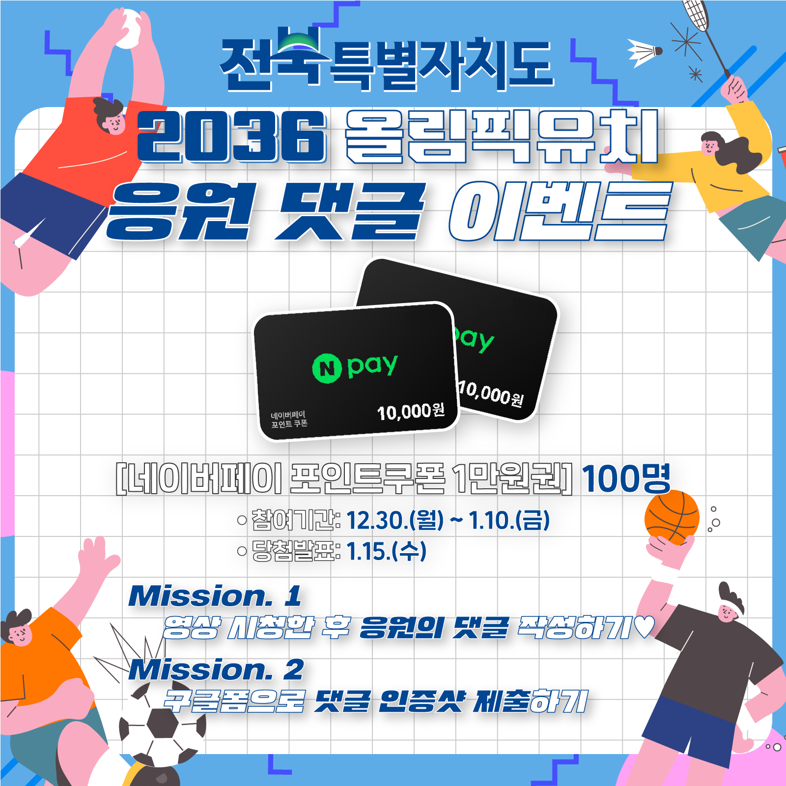또한 전북특별자치도는 2036 하계올림픽 전북 유치를 기원하는 숏폼영상도 제작하여 공식 유튜브 채널에 게시하고 도민 누구나 쉽게 참여할 수 있는 응원댓글 이벤트를 진행한다고 밝혔다.