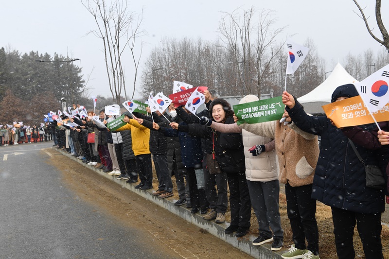 7일 500여 명의 완주군 주민들이 매서운 추위를 뚫고 완주 테니스장 앞에서 하계올림픽 현장 평가단을 환영했다.