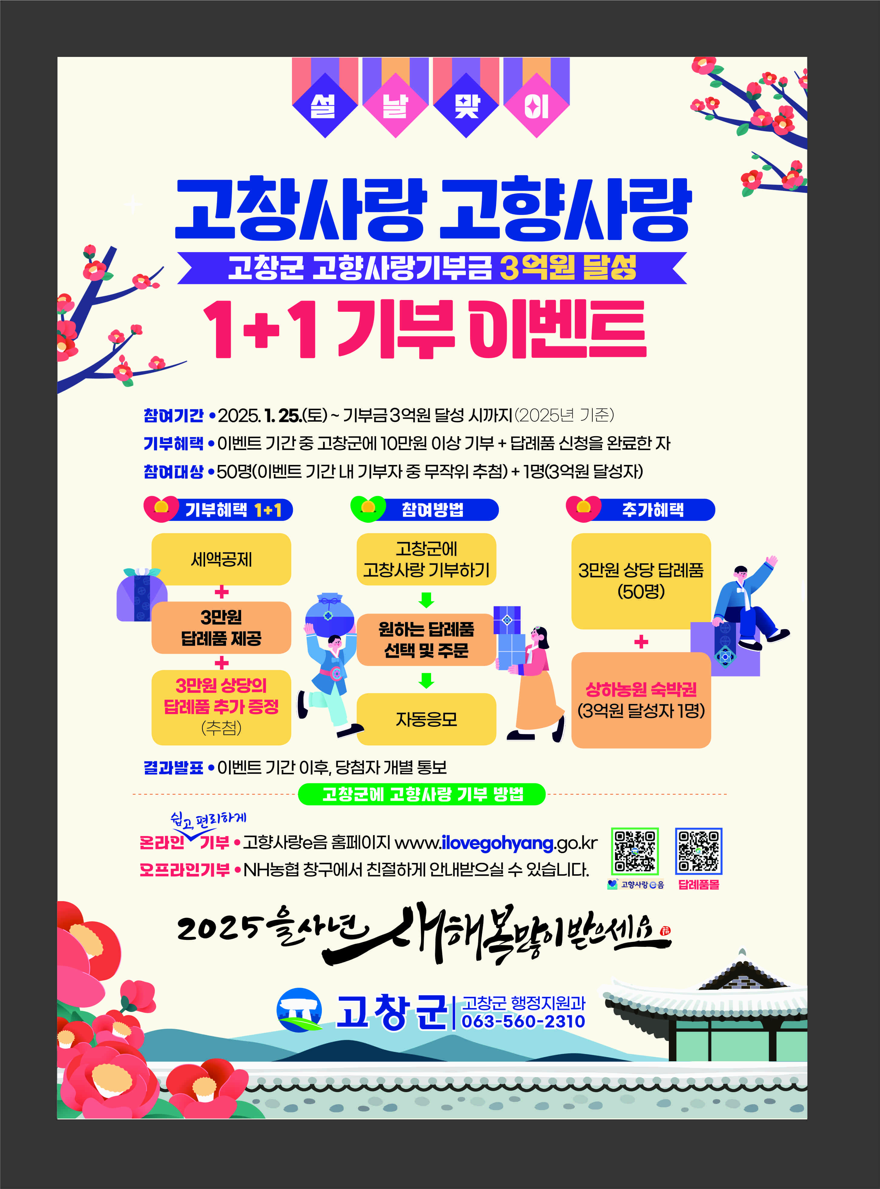 [고창=뉴전북] 고창군이 설을 맞아 고향사랑기부 활성화을 위한 1+1 기부이벤트를 진행한다고 23일 밝혔다.