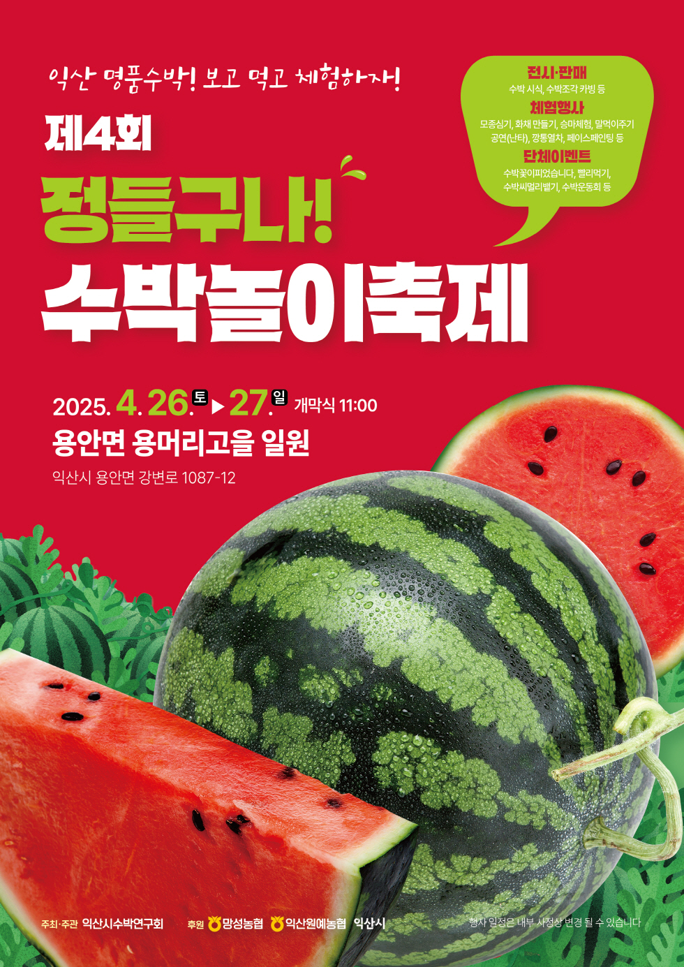 수박놀이축제는 지역농산물 소비를 촉진하고, 농업인과 소비자 간의 소통을 확대하고자 마련됐다. 축제는 용안·망성면 농가로 구성된 익산시 수박연구회(회장 윤범열)가 주최·주관한다.