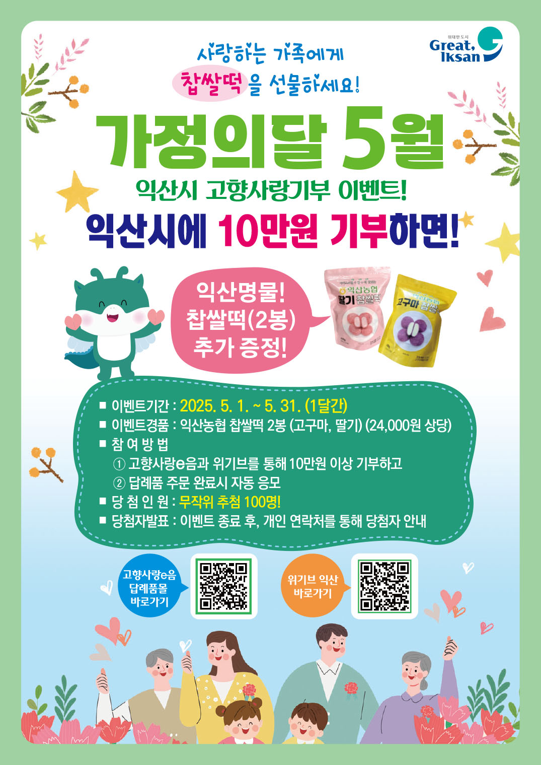 익산시는 가정의 달을 맞아 5월 1일부터 31일까지 '고향사랑기부제 답례품 추가 증정 이벤트'를 진행한다.
