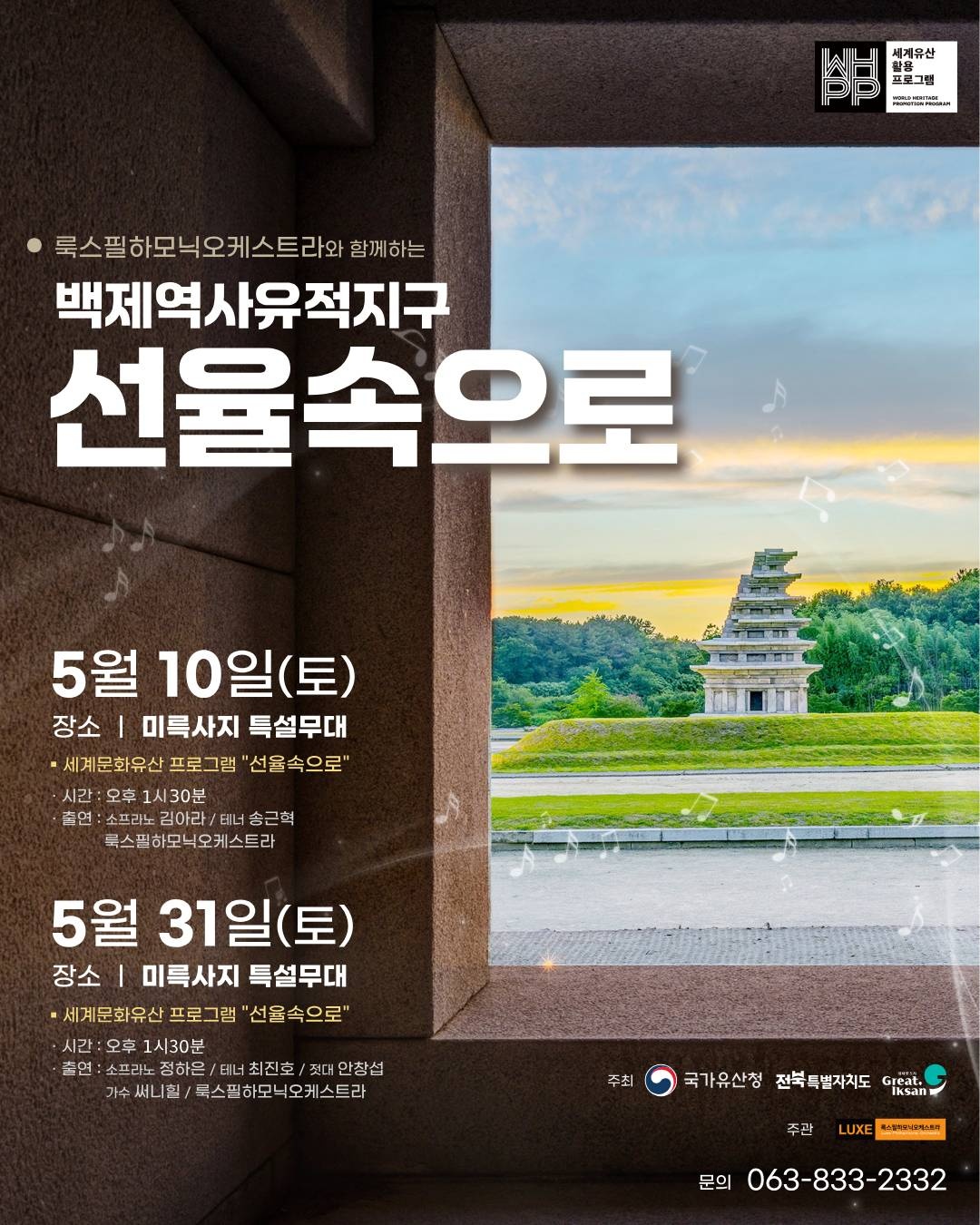 '백제역사유적지구 선율속으로'는 오는 10일 오후 130분 미륵사지 특설무대에서 첫 공연이 열린다. 룩스필하모닉오케스트라와 함께 소프라노 김아라, 팬텀싱어 출신 테너 송근혁 등이 출연해 창작곡과 영화 OST, 클래식 갈라공연으로 이뤄진 감동적인 무대를 선보인다.