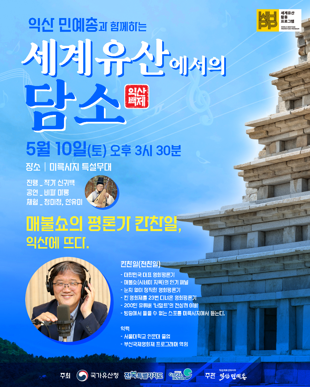 '세계유산에서의 담소'는 대중성과 전문성을 겸비한 명사를 초청해 시민들과 만남의 자리를 가지는 프로그램이다. 오는 10일 오후 330분 미륵사지에서 영화평론가 전찬일을 초청해 첫 포문을 연다.