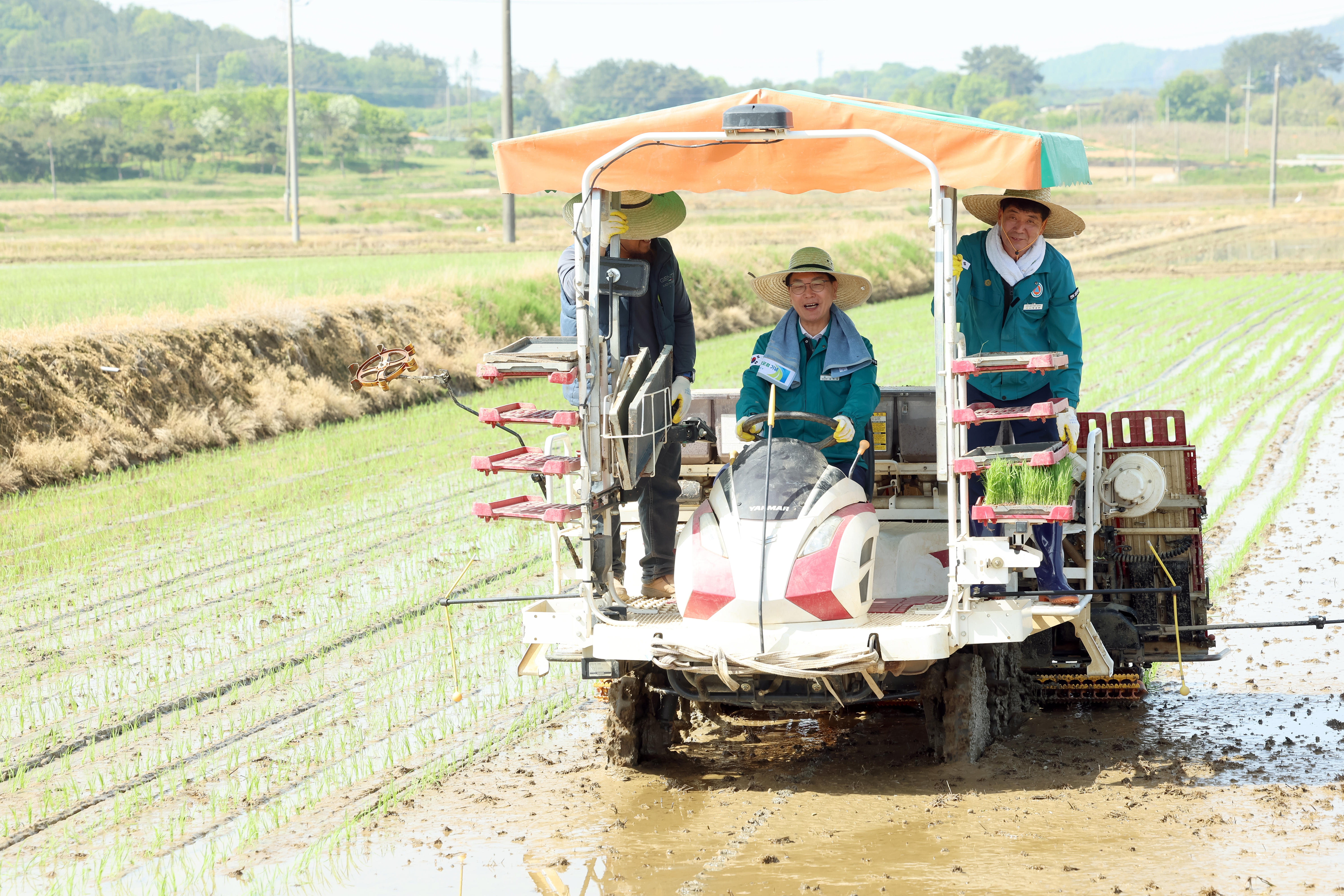 심덕섭 고창군수와 조민규 고창군의회 군의장과 군의원들은 8일 오전 신림면 송용리 모내기 현장을 찾아 직접 이앙기에 올라 모내기를 실시했다.