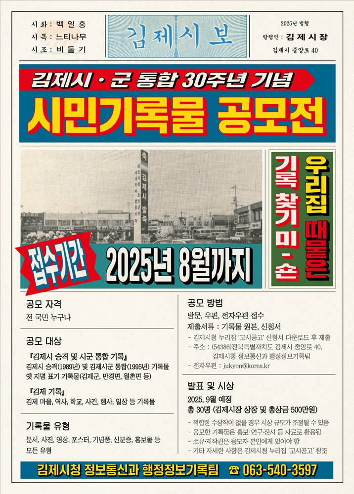 공모대상은 지난 2000년 이전 김제시 관련 민간기록물로, 특히 김제시‧군 통합 30주년으로써 1989년 김제시 승격과 1995년 김제시‧군 통합 과정 등 시의 역사와 문화가 담긴 다양한 자료를 집중적으로 수집한다.