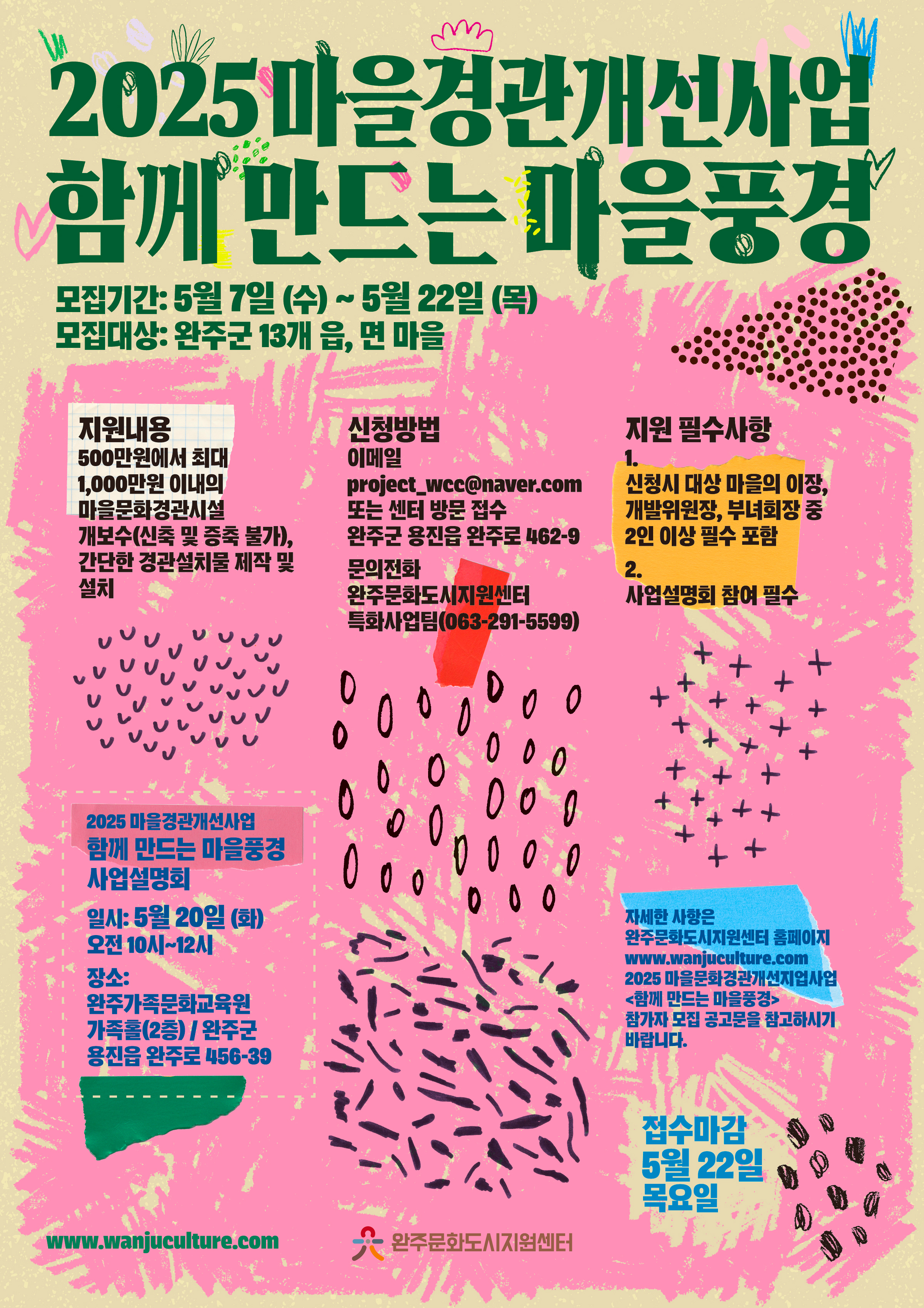 [사회=뉴전북] 완주문화도시지원센터가 주관하는 ‘2025 마을경관개선사업–함께 만드는 마을풍경’ 사업설명회가 5월 20일(화) 오전 10시에 완주가족문화교육원 가족홀에서 열린다. 이번 설명회는 2025년 마을경관개선 공모사업에 참여를 희망하는 완주군 내 13개 읍·면의 마을공동체를 대상으로, 사업 개요와 참여 절차를 상세히 안내하기 위해 마련됐다.