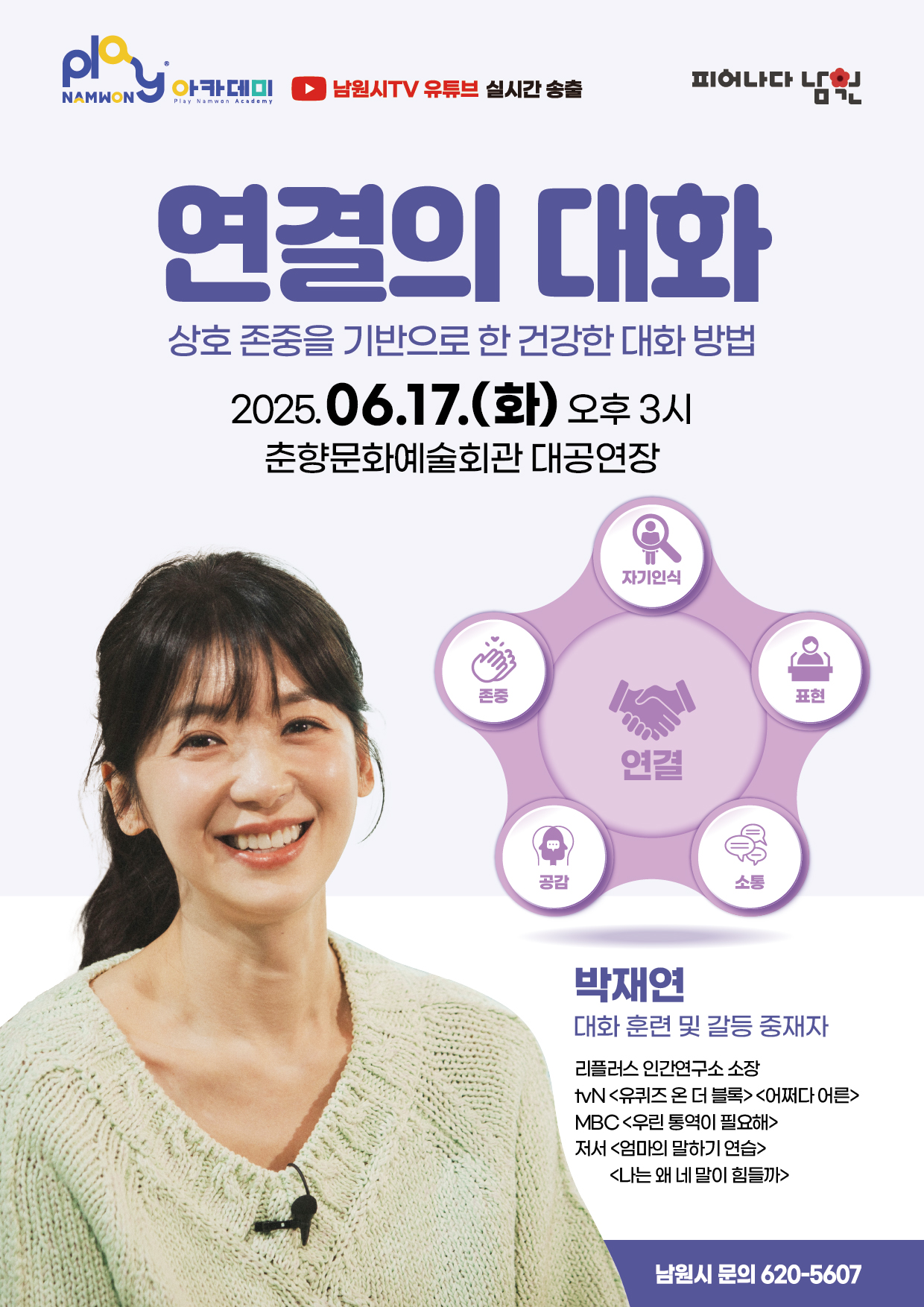 [남원=뉴전북] 남원시(시장 최경식)17() 오후 3, 춘향문화예술회관 대공연장에서 관계 심리 소통 전문가 박재연 소장을 초청하여 상호존중을 기반으로 한 건강한 대화방법 <연결의 대화>”라는 주제로 강연을 개최한다.
