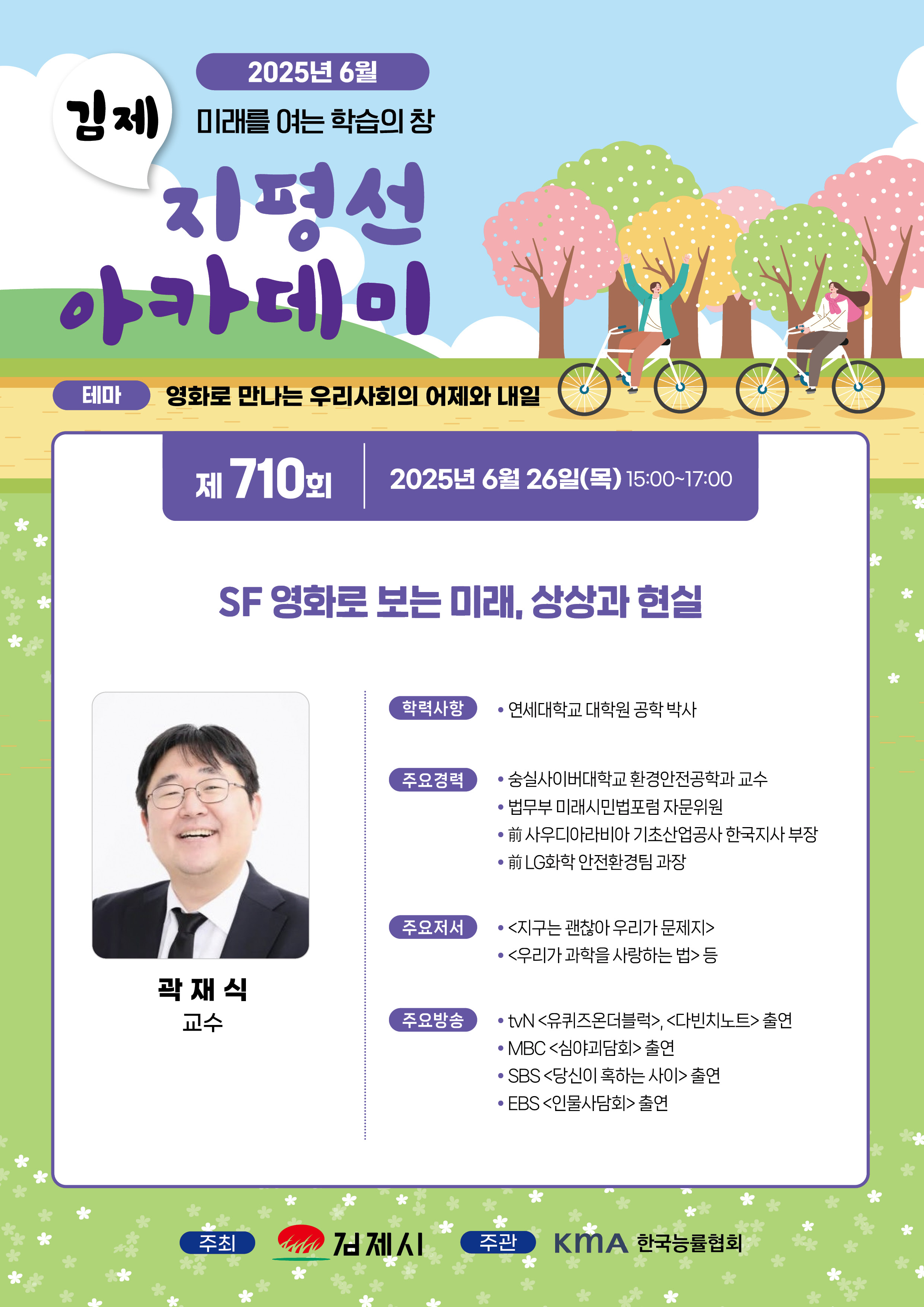 이어지는 오는 26일 강연에서는 과학소설 작가이자 과학 커뮤니케이터로 활발히 활동 중인 곽재식 교수가 ‘SF 영화로 보는 미래, 상상과 현실’이라는 주제로 강연을 이어간다. 곽 교수는 다양한 SF 영화를 통해 인류가 꿈꾸는 미래와 과학기술의 발전 가능성, 그리고 그 안에 숨겨진 철학적 질문들을 유쾌하면서도 진지하게 풀어낼 예정이다. 영화 속 상상이 현실이 되어가는 오늘날, 이번 강연은 우리모두가 마주할 미래를 고민해보는 소중한 기회를 제공할 것이다.