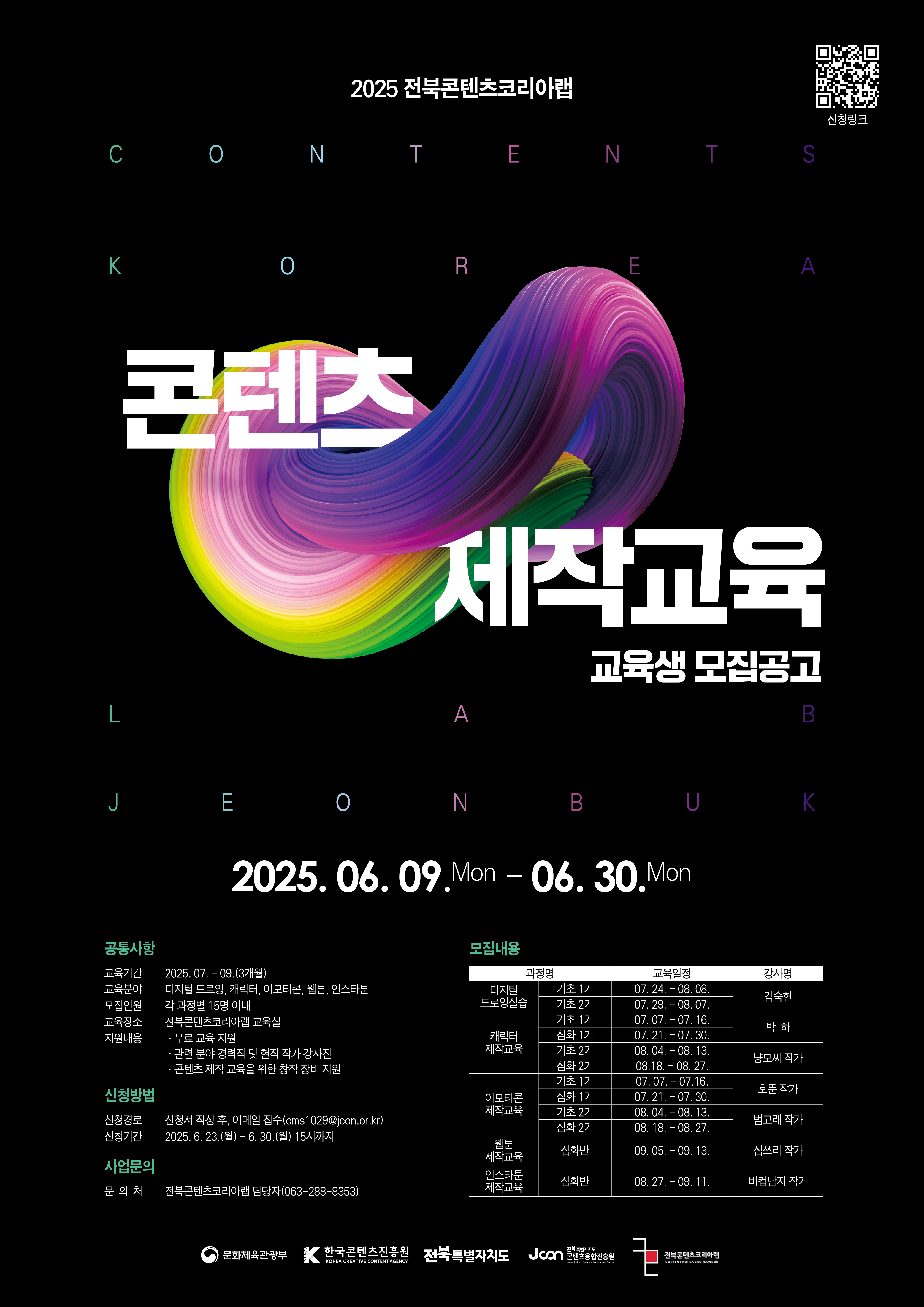 교육은 7월부터 9월까지 전북콘텐츠코리아랩 내 교육공간에서 운영되며, 현직 작가로 구성된 강사진이 참여해 콘텐츠 제작 실습, 이론 교육, 수익화 전략 등 전 과정에 걸쳐 실질적인 교육을 제공할 예정이다.