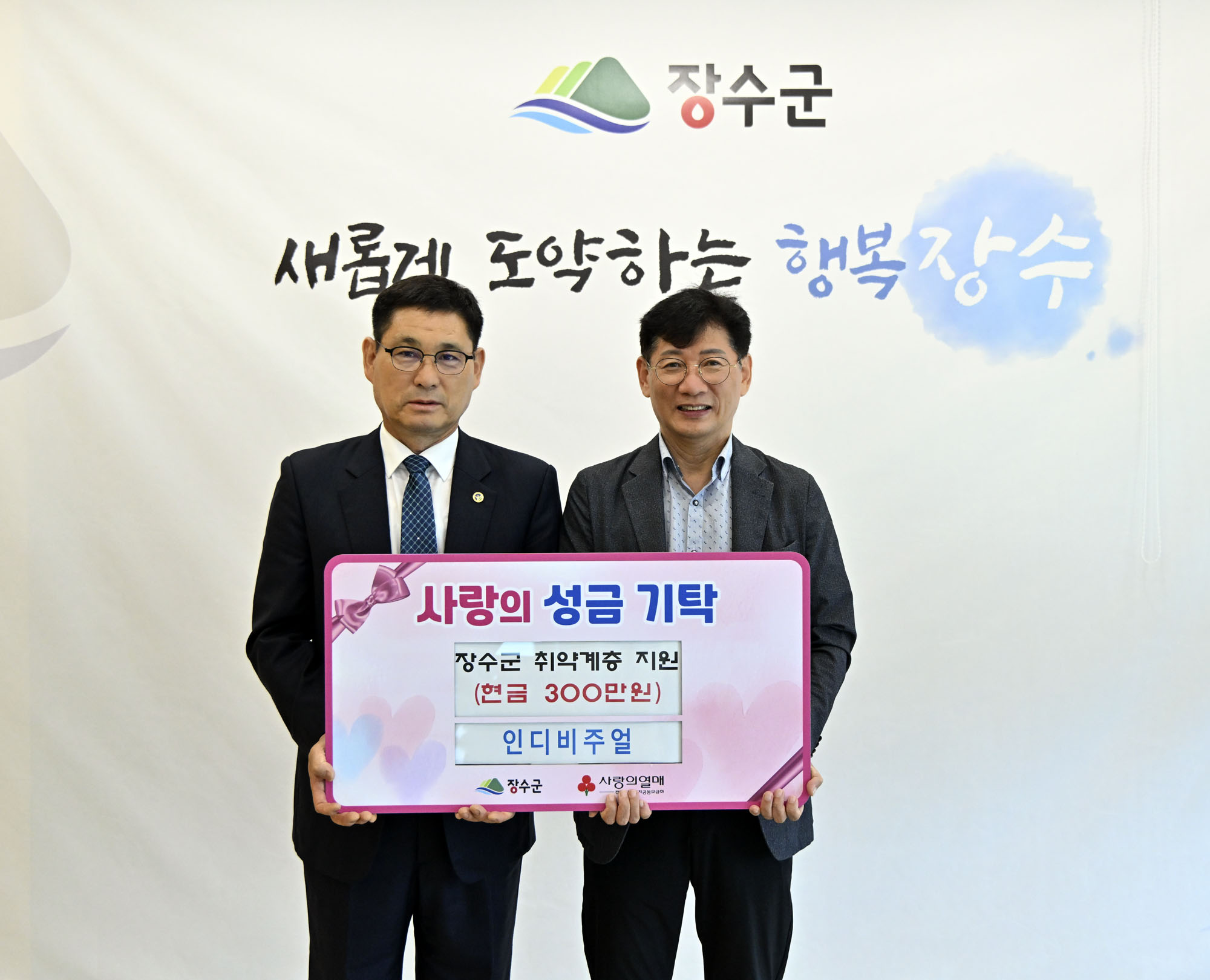 [장수=뉴전북]장수군은 임실군 운암면 소재 카페 ‘인디비주얼’(대표 박춘열)에서 취약계층 지원을 위한 성금 300만 원을 기탁했다고 18일 밝혔다.