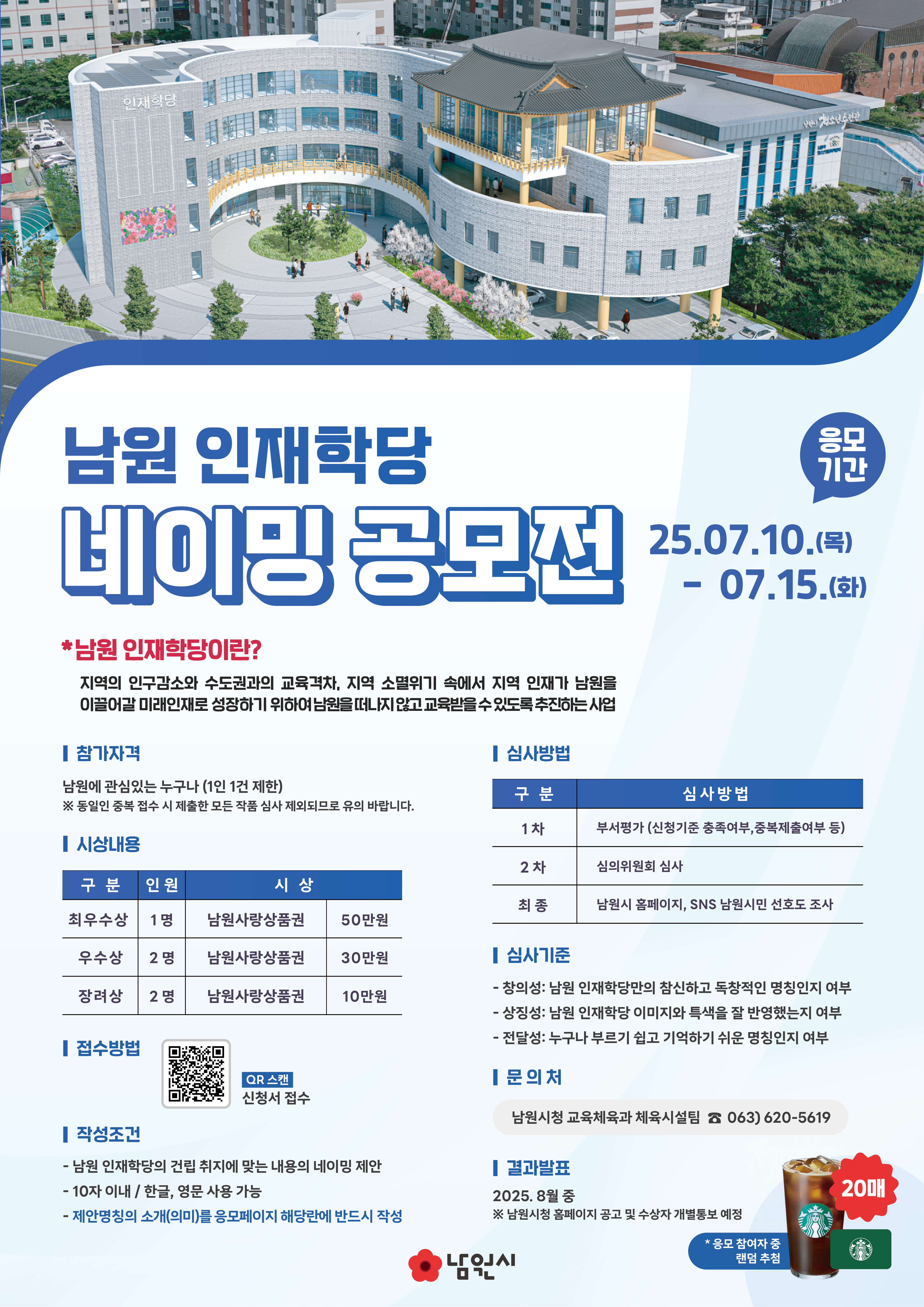 이번 공모전은 남원 인재학당 건립 취지에 맞는 의미있고 참신한 새 이름을 찾기 위하여 실시되며 남원에 관심이 있는 누구나 참여가 가능하다.