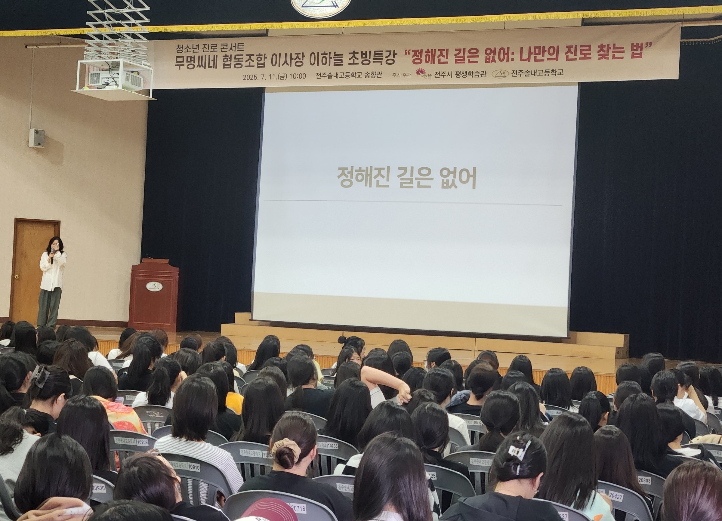 - - 전주시 평생학습과, 11일 전주솔내고에서 청소년 인문융합 진로 콘서트 개최 - 이하늘 무명씨네 대표 초청돼 다양한 경험이 만들어낸 ‘나만의 길’ 주제로 학생들과 소