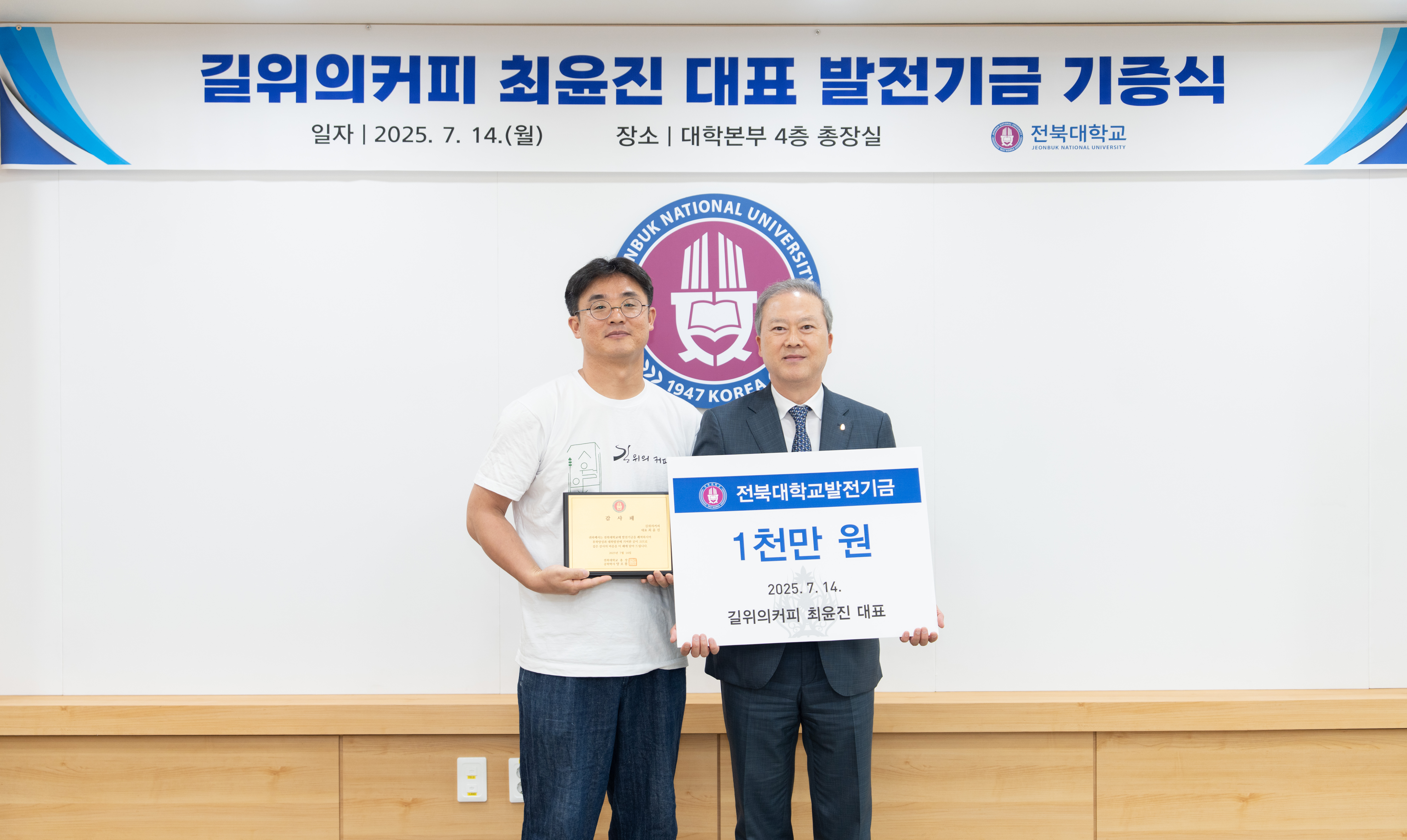 [교육=뉴전북] 전북대학교(총장 양오봉)에 길위의커피 최윤진 대표가 사회복지학과 학생들을 위해 1천만 원의 발전기금을 기부했다.