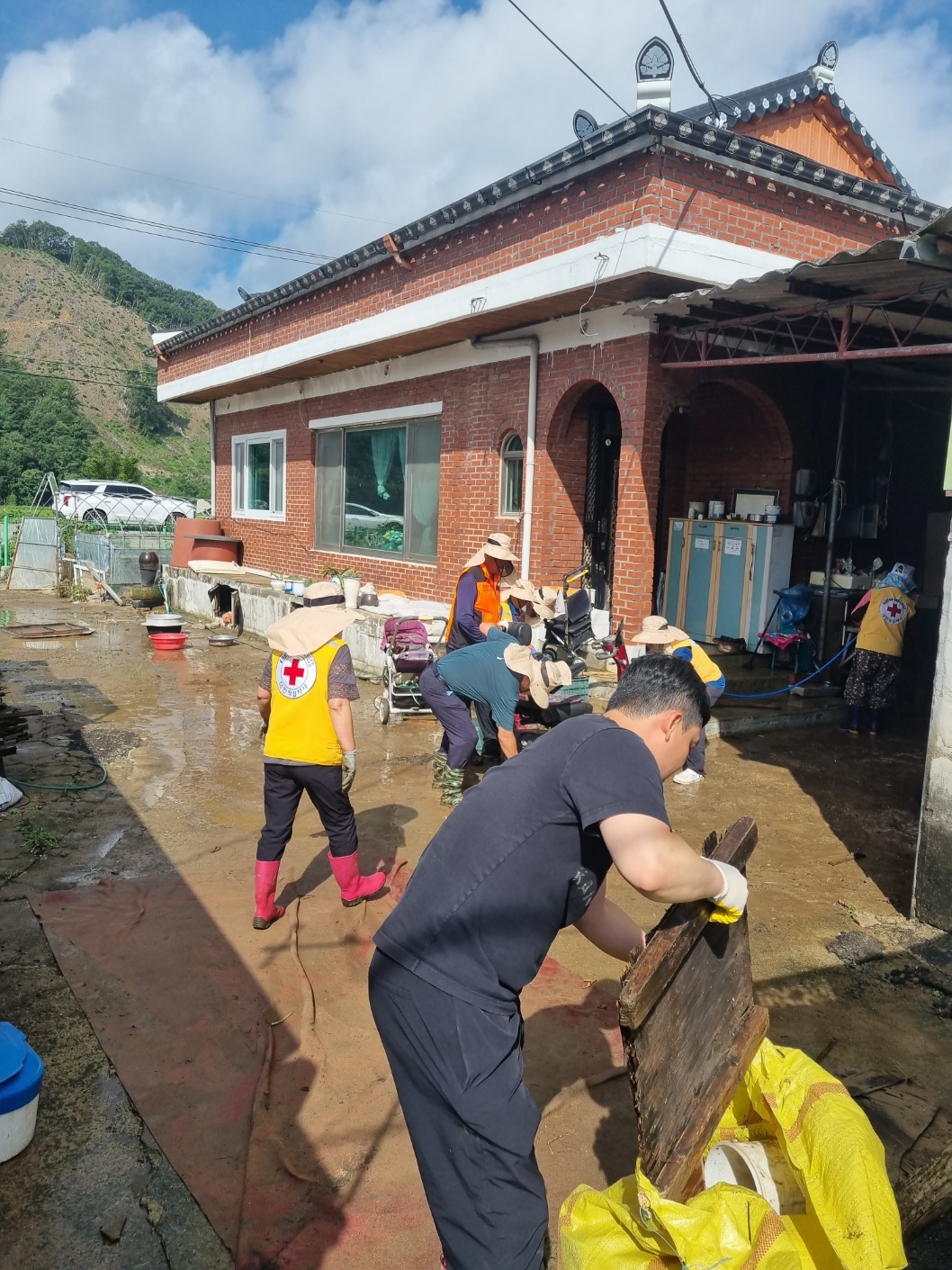 침수 피해를 입은 가수마을에서 행정과 관내 봉사단, 지역주민들이 함께 합동 복구활동