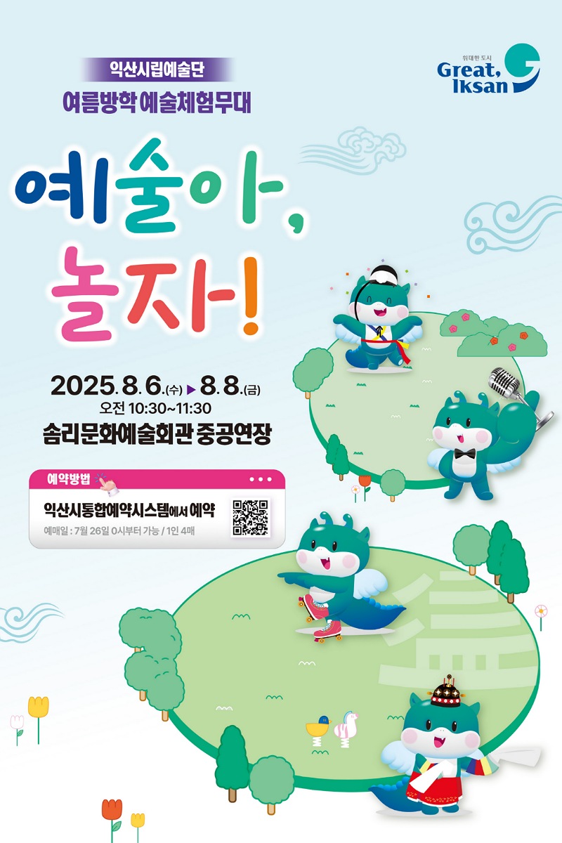 김강희 익산예술의전당 관장은 "아이들이 예술을 체험하며 더 밝고 건강하게 성장하길 바란다"며 "가족이 함께하는 뜻깊은 여름방학이 되길 기대한다"고 말했다.