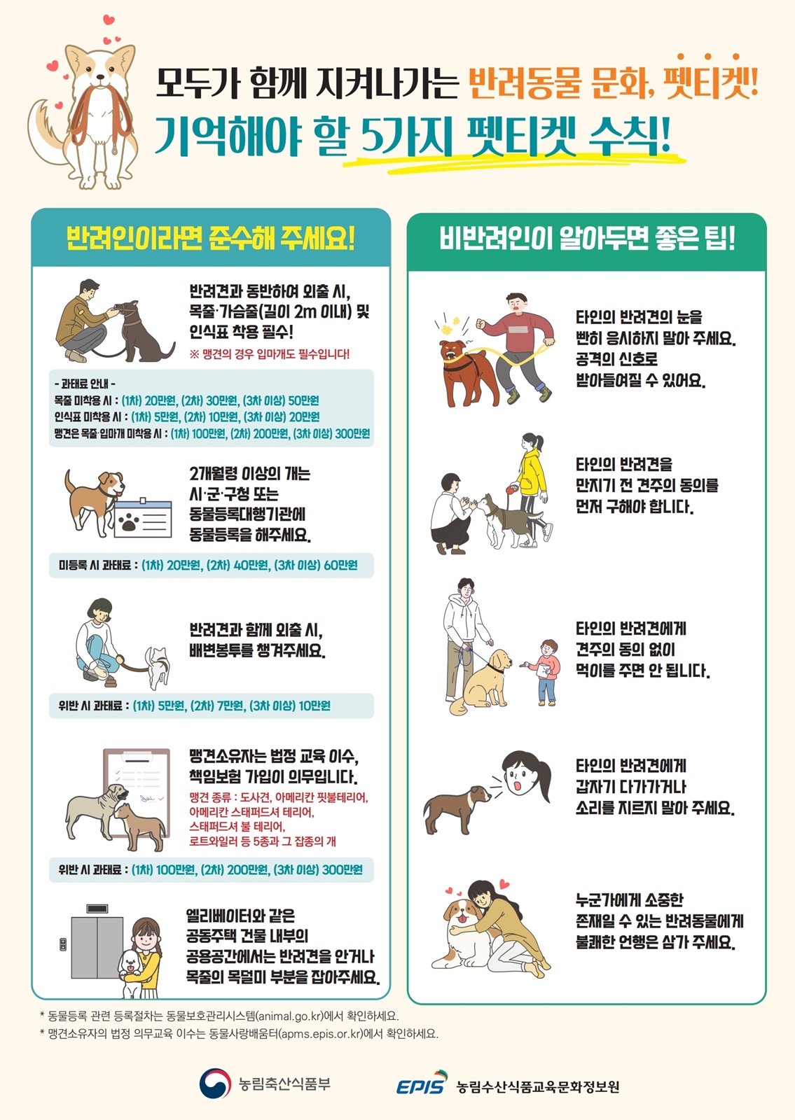 반려인이 지켜야 할 5가지 펫티켓으로는 ▲반려견과 외출 시 2m 이내의 목줄 및 인식표 착용하기 ▲2개월령 이상인 개에 대한 군청이나 동물 등록 대행 기관에 동물 등록하기 ▲외출 시 배변 봉투를 지참하여 배설물 수거하기 ▲맹견을 사육하려는 자는 군청에 맹견 사육 허가를 받고 맹견 법정 교육 이수 및 책임보험 의무적 가입하기가 있다.