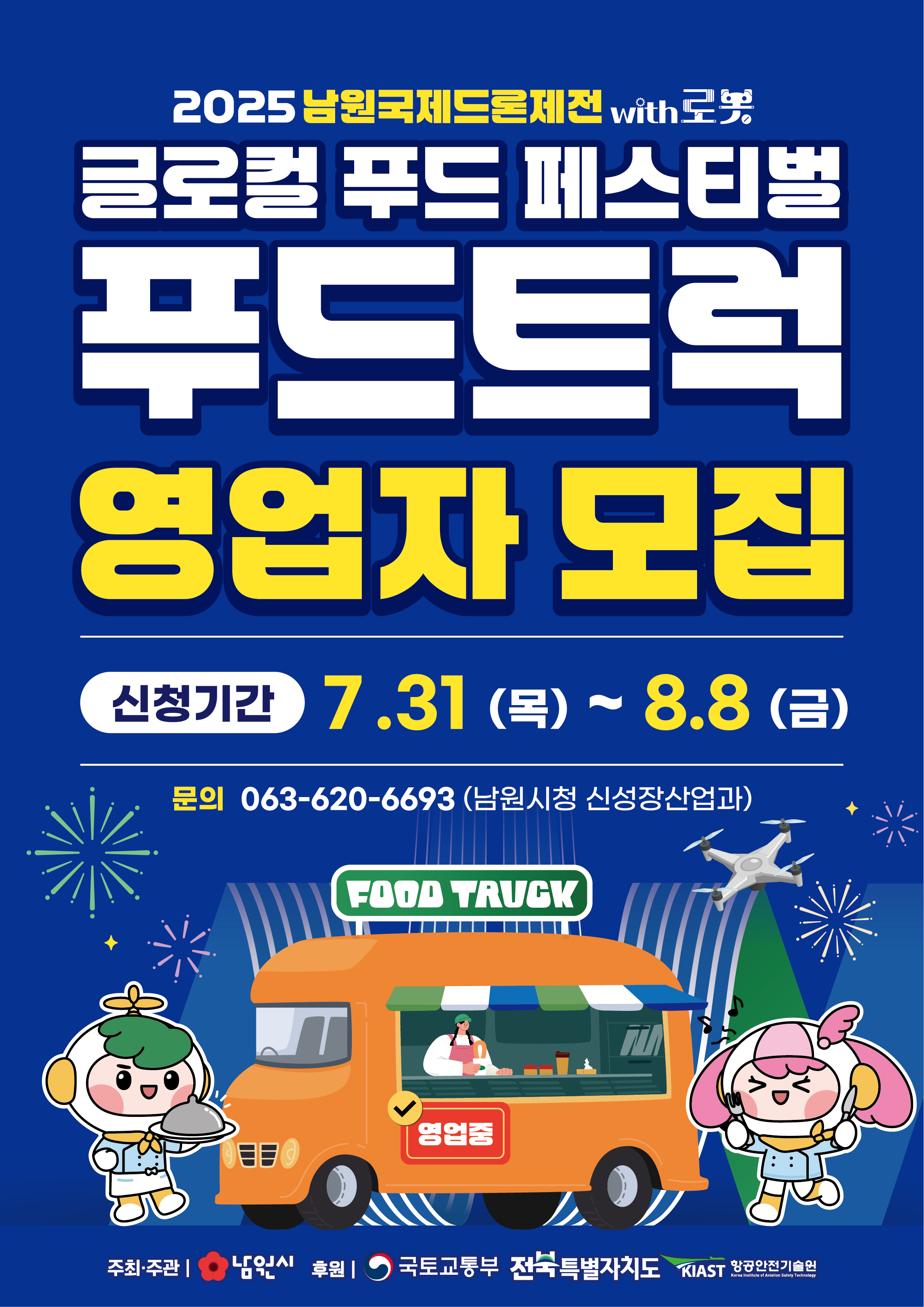 최경식 남원시장은 “이번 2025 남원국제드론제전은 기술과 문화가 융합된 축제로, 푸드트럭 운영을 통해 지역경제 활성화와 글로벌 음식문화 교류의 장이 될 것으로 기대한다”라며 “창의적이고 열정적인 푸드트럭 운영자들의 많은 참여를 바란다”라고 밝혔다.