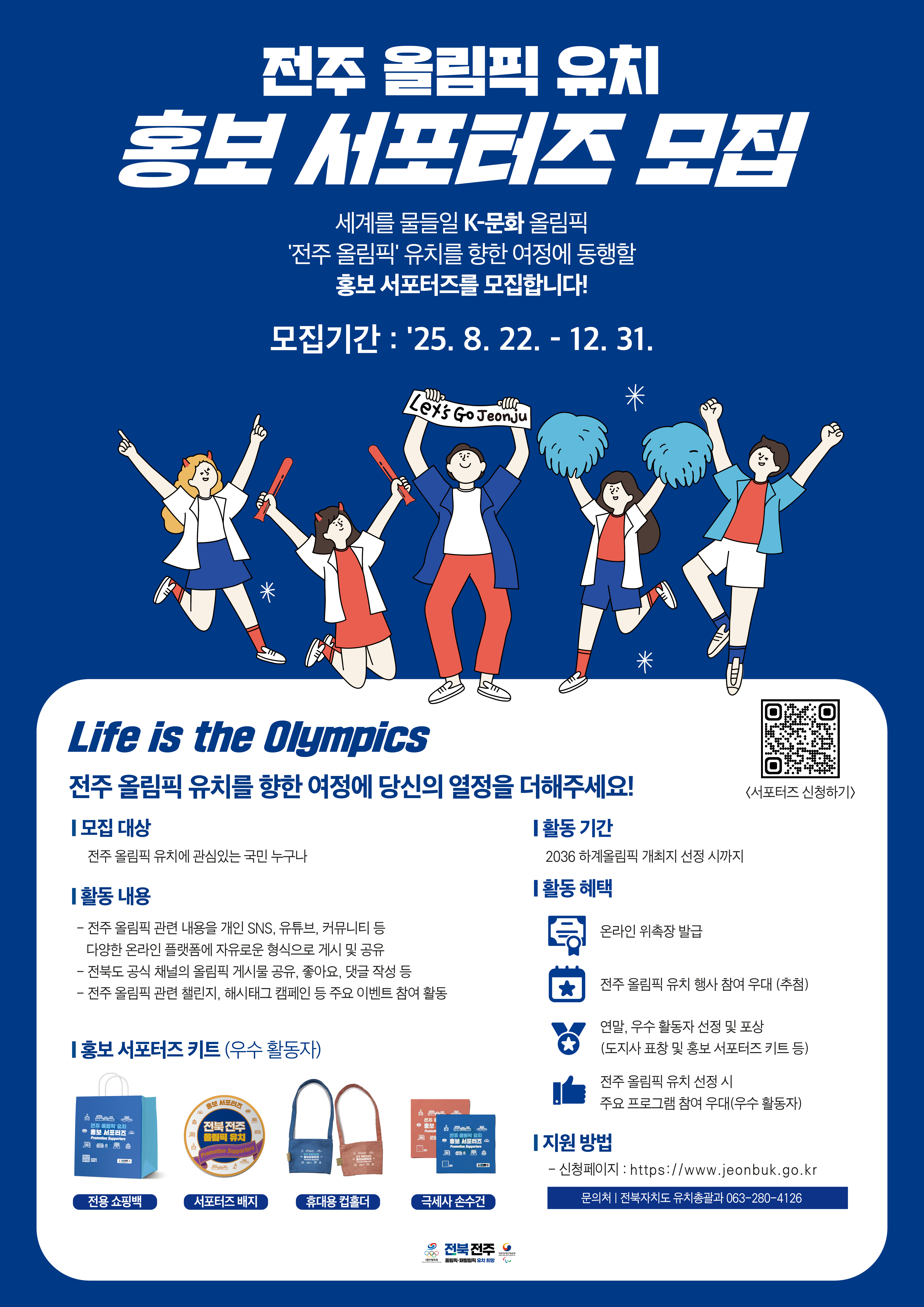 모집 기간은 오는 8월 22일부터 12월 31일까지이며, 전주 올림픽 유치에 관심 있는 국민 누구나 신청할 수 있다. 신청은 전북특별자치도 누리집에서 본인 인증 후 가능하다.