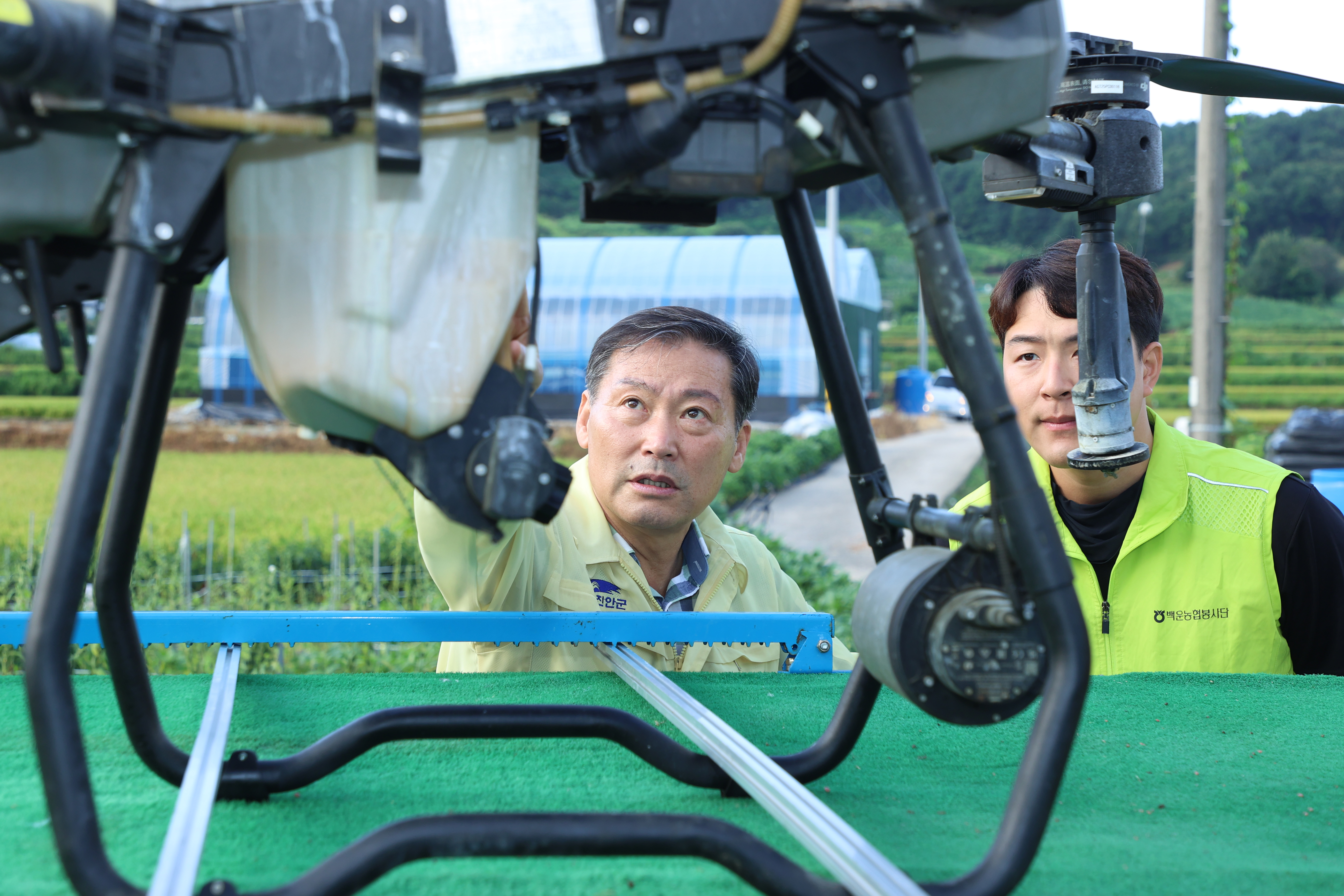[진안=뉴전북] 전춘성 진안군수가 고온기에 확산 우려가 커지는 벼 병해충 차단을 위해 25일 조생종 벼 재배지를 중심으로 진행된 3차 공동방제 현장을 직접 찾아 농업인들을 격려하고, 선제적 대응을 당부했다.