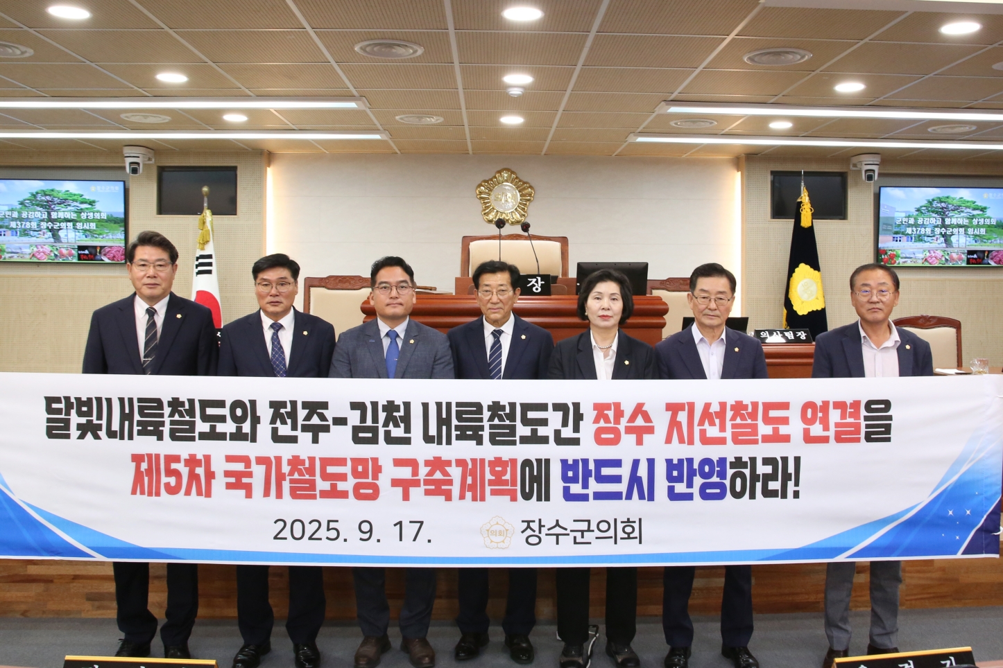 [장수=뉴전북] 장수군의회(의장 최한주)는 제378회 임시회 제1차 본회의에서 달빛내륙철도 장수읍 경유와 전주–김천 영호남내륙철도 지선철도 신설을 촉구하는 결의안을 만장일치로 채택했다.