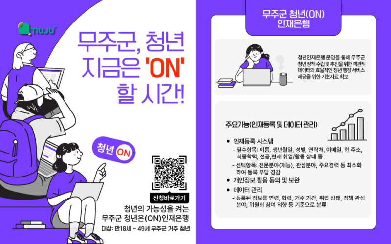 올해 8월 시행에 들어간 청년(ON) 인재은행은 무주군에 거주하는 만 18세부터 49세까지 청년들의 인재 정보를 확보해 신뢰성 있는 정책 기초자료를 구축·운영한다.