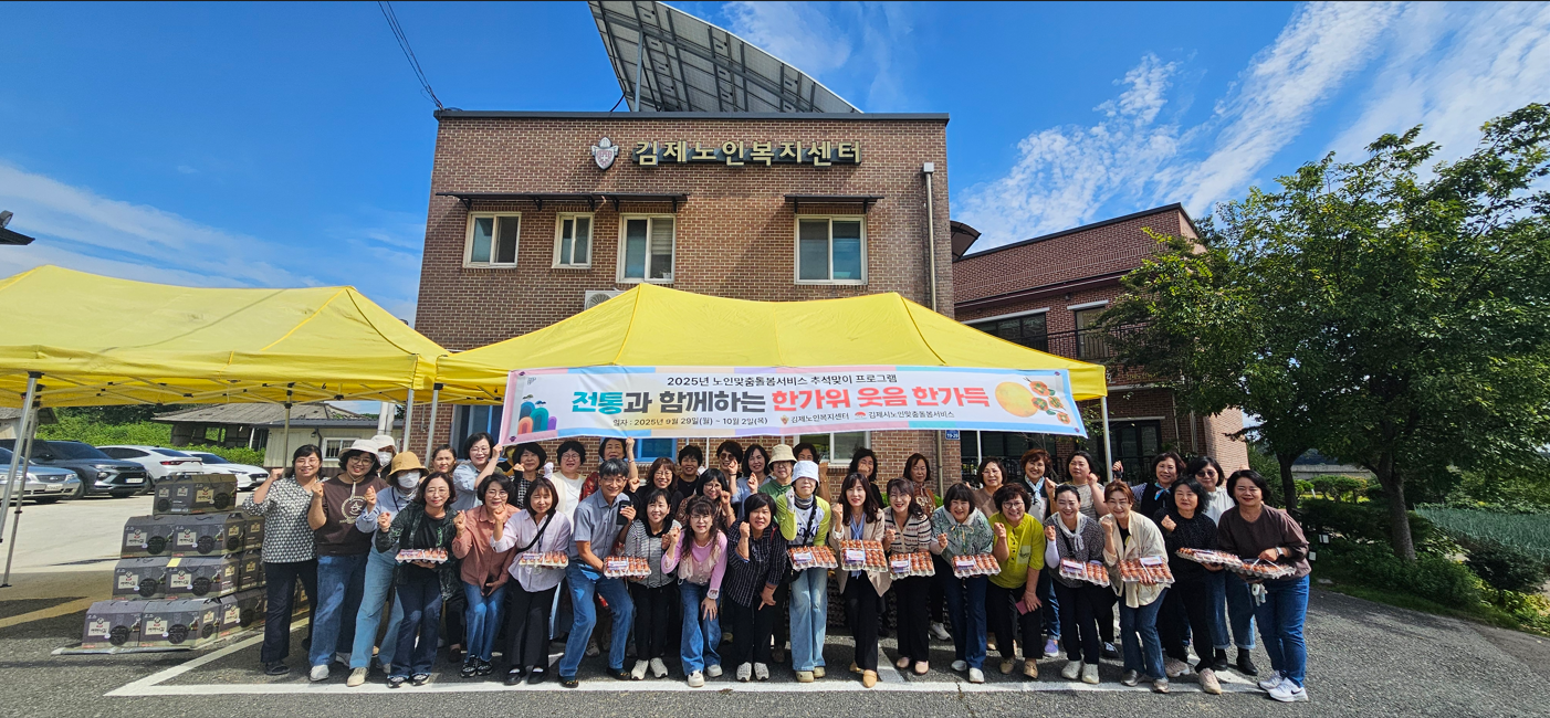 [±èÁ¦=´ºÀüºÏ]±èÁ¦½Ã(½ÃÀå Á¤¼ºÁÖ)´Â ±èÁ¦³ëÀκ¹Áö¼¾ÅÍ(¼¾ÅÍÀå ¹Ú³²ÁÖ)°¡ Ãß¼®À» ¸Â¾Æ 29ÀϺÎÅÍ ¿À´Â 10¿ù 2ÀϱîÁö ³ëÀθÂÃãµ¹º½¼ºñ½º 1,035¸í ¾î¸£½ÅÀ» ´ë»óÀ¸·Î ¡®ÀüÅë°ú ÇÔ²²ÇÏ´Â ÇѰ¡À§, ¿ôÀ½ ÇѰ¡µæ¡¯ Çà»ç¸¦ ÁøÇàÇÑ´Ù°í ¹àÇû´Ù.
