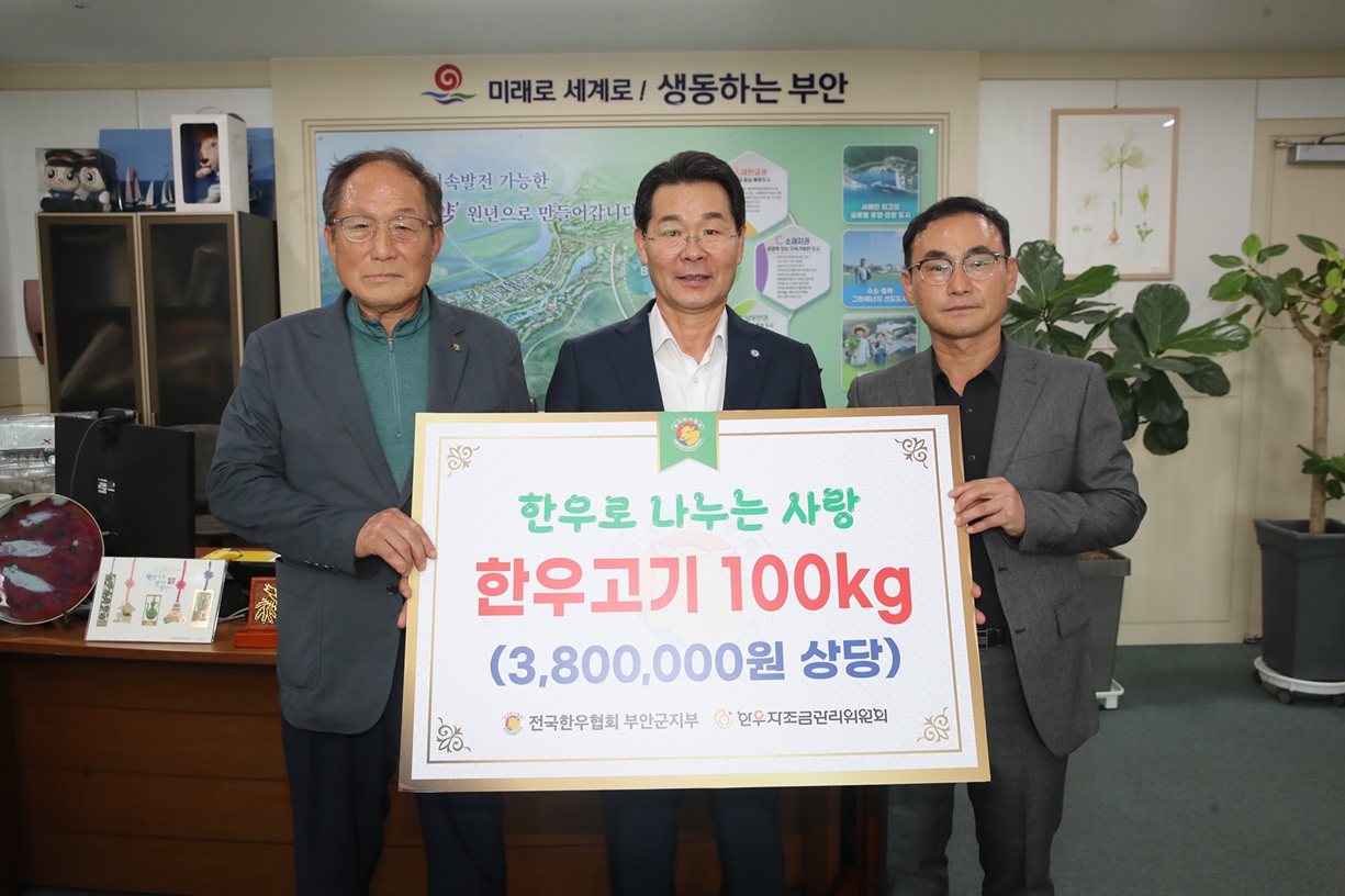 권익현 부안군수는 “전국한우협회 부안군지부의 따뜻한 마음에 감사드리며, 기탁된 한우고기는 어려운 이웃들에게 전달하여 풍성한 명절 분위기를 조성하는데 사용하겠다”고 전했다.