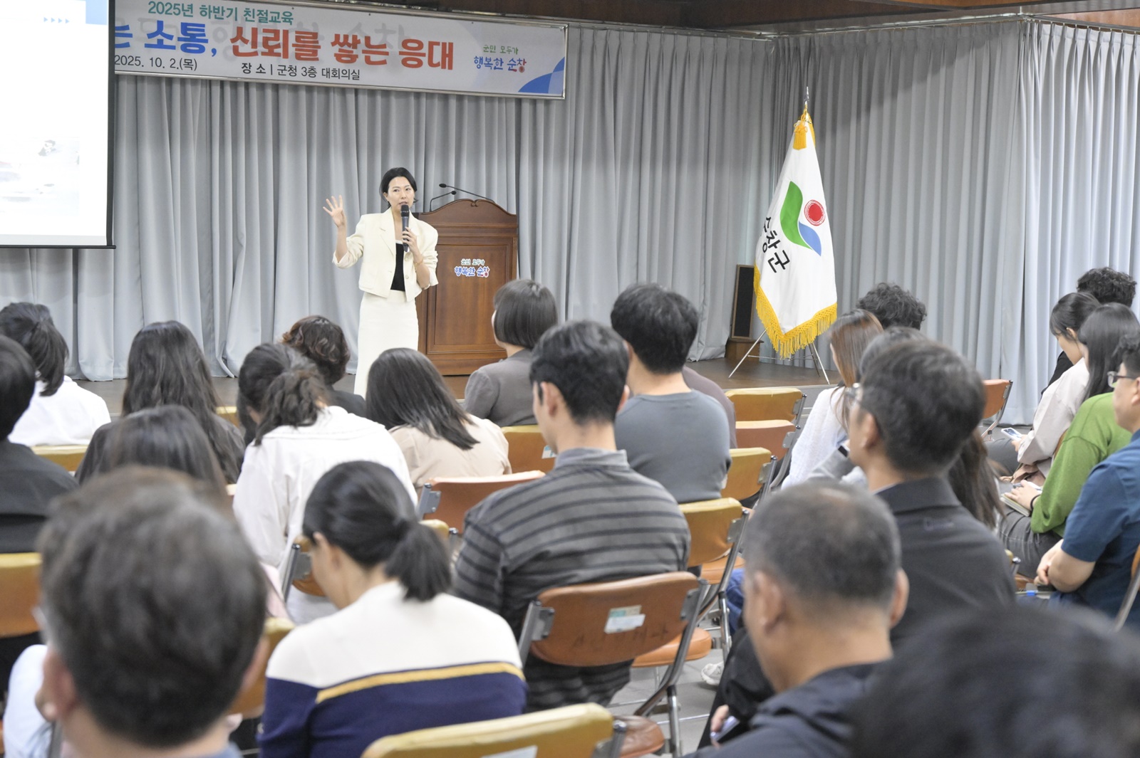 군은 2일 군청 대회의실에서 직원 150여 명을 대상으로 ‘마음을 여는 소통, 신뢰를 쌓는 응대’를 주제로 친절 서비스 교육을 진행했다고 밝혔다.