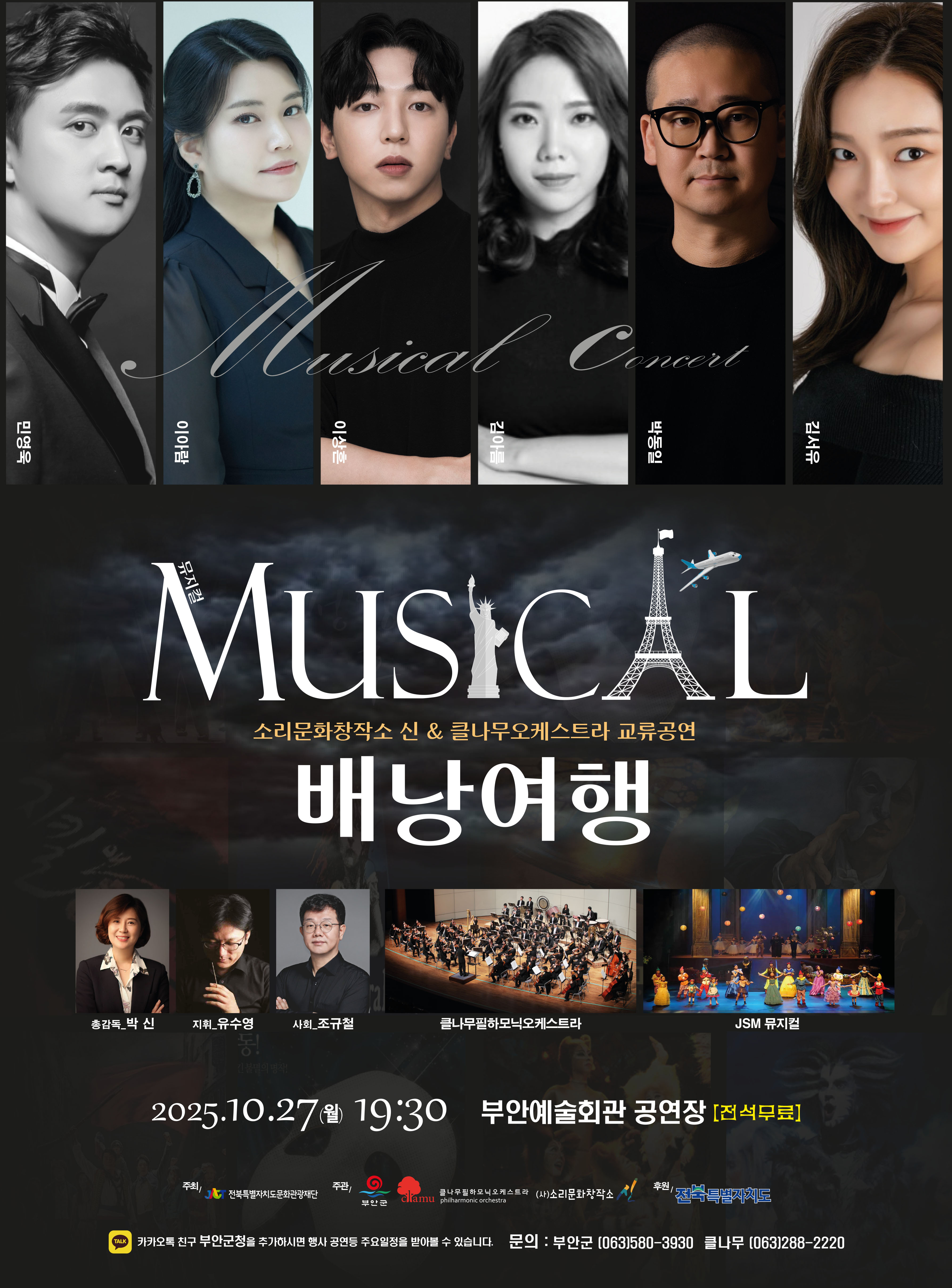 이번 무대에는 뮤지컬배우겸 성악가 민영욱, 이아람, 이상흔, 김아름, 박동일, 김서유, JSM뮤지컬앙상블이 출연해 각자의 매력 넘치는 보이스와 연기력으로 다양한 뮤지컬 명곡을 선보인다. 또한 클나무필하모닉오케스트라의 웅장한 라이브 연주가 함께 어우러져 더욱 풍성한 무대를 완성한다.