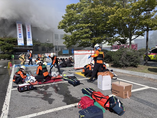 ƯÈ÷ ÇöÀå¿¡´Â ¼Ò¹æÇï±â, ½ÅÇü¼Ò¹æÂ÷, ±â»ó°üÃøÂ÷·®, ±¸±ÞÂ÷, µå·Ð, ±¼»è±â µî ´Ù¾çÇÑ Àåºñ°¡ µ¿¿øµÆÀ¸¸ç, Æø¹ßÀ½, ¿¬¸·Åº µîµµ Ȱ¿ëµÇ¾î ½ÇÁ¦ Àç³ÇöÀå°ú °°Àº Àå¸éÀ» ¿¬ÃâÇØ, ÈÆ·Ã Âü°¡ÀÚµéÀº »óȲÀüÆÄ´Â ¹°·Ð, ±ä±Þ±¸Á¶ Ȱµ¿ ¹× ¼ö½À¡¤º¹±¸È°µ¿±îÁö Àç³»óȲ Àü¹Ý¿¡ ´ëÇØ °¢ÀÚ ¸ÃÀº ¹Ù ÀÓ¹«¸¦ Ãæ½ÇÈ÷ ¼öÇàÇß´Ù.