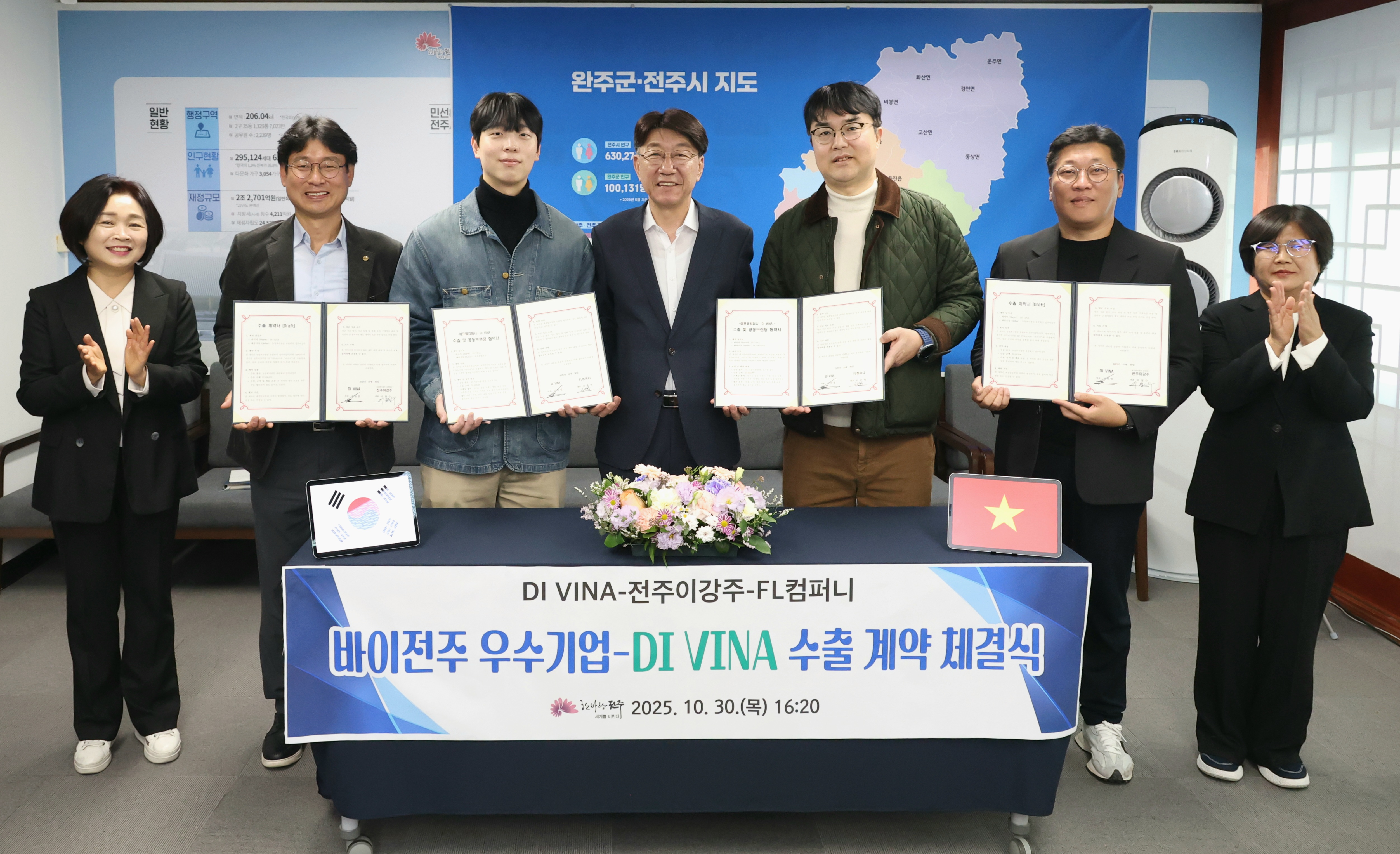 시는 30일 전주시장실에서 우범기 전주시장과 김완엽 DI VINA 대표, 바이전주 우수기업 대표 등이 참석한 가운데 ‘바이전주 우수업체-DI VINA 수출계약 체결식’을 가졌다.