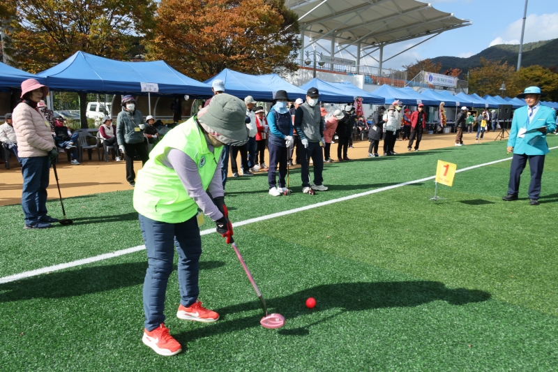 지난 1일 무주군 안성면 체육공원에서 열린 ‘2025년 어르신 가족사랑 그라운드골프대회’에서 한 선수가 경기를 진행 중이다.
