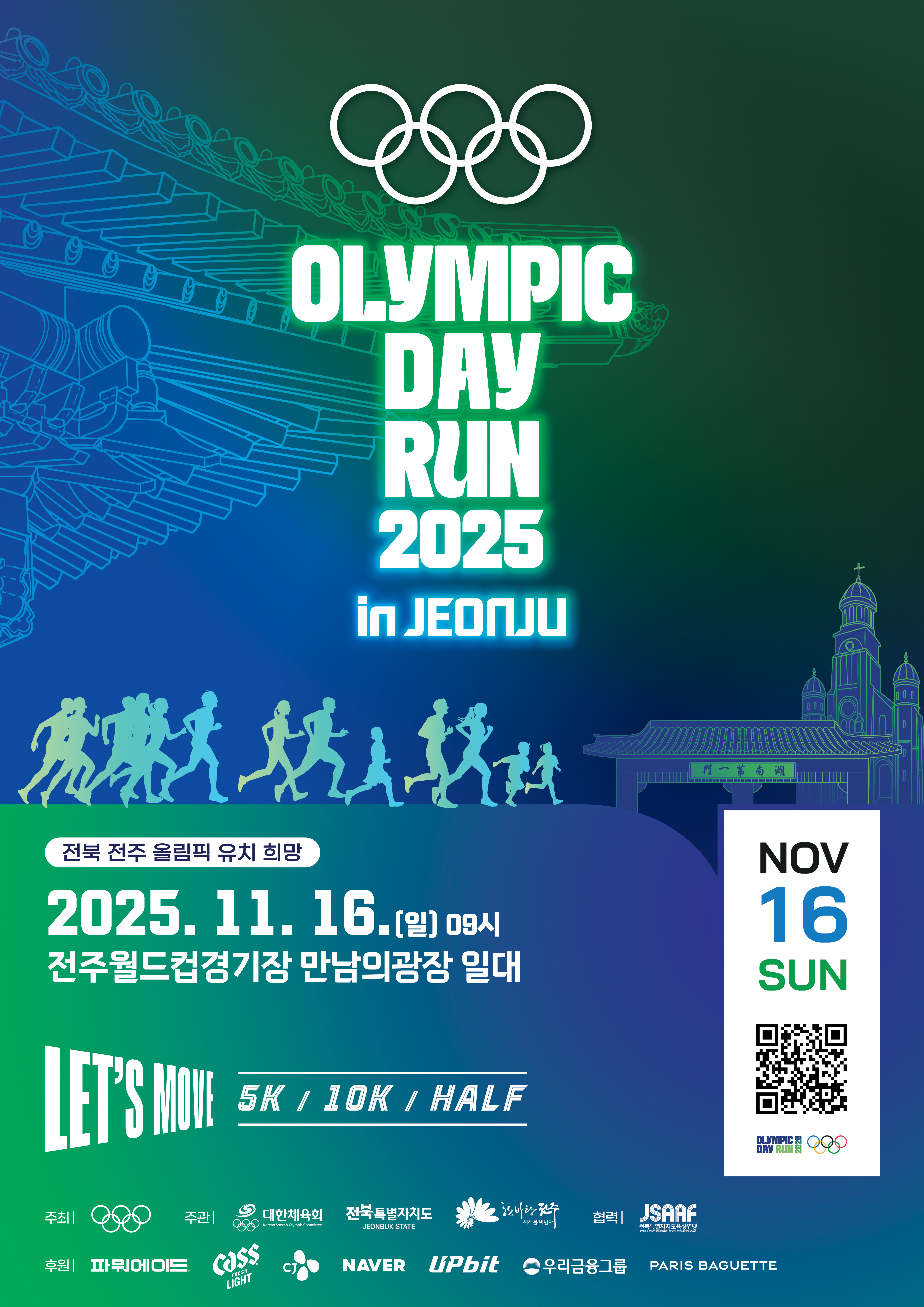 • - 오는 16일 전주에서 전주 올림픽 유치 기원하며 함께 달리는 ‘올림픽데이런 2025 in 전주’ 개최 - 전국 각지에서 모인 6000명 참가자, 전주의 가을 거리 위 달리며 하나 되는 시간 가져