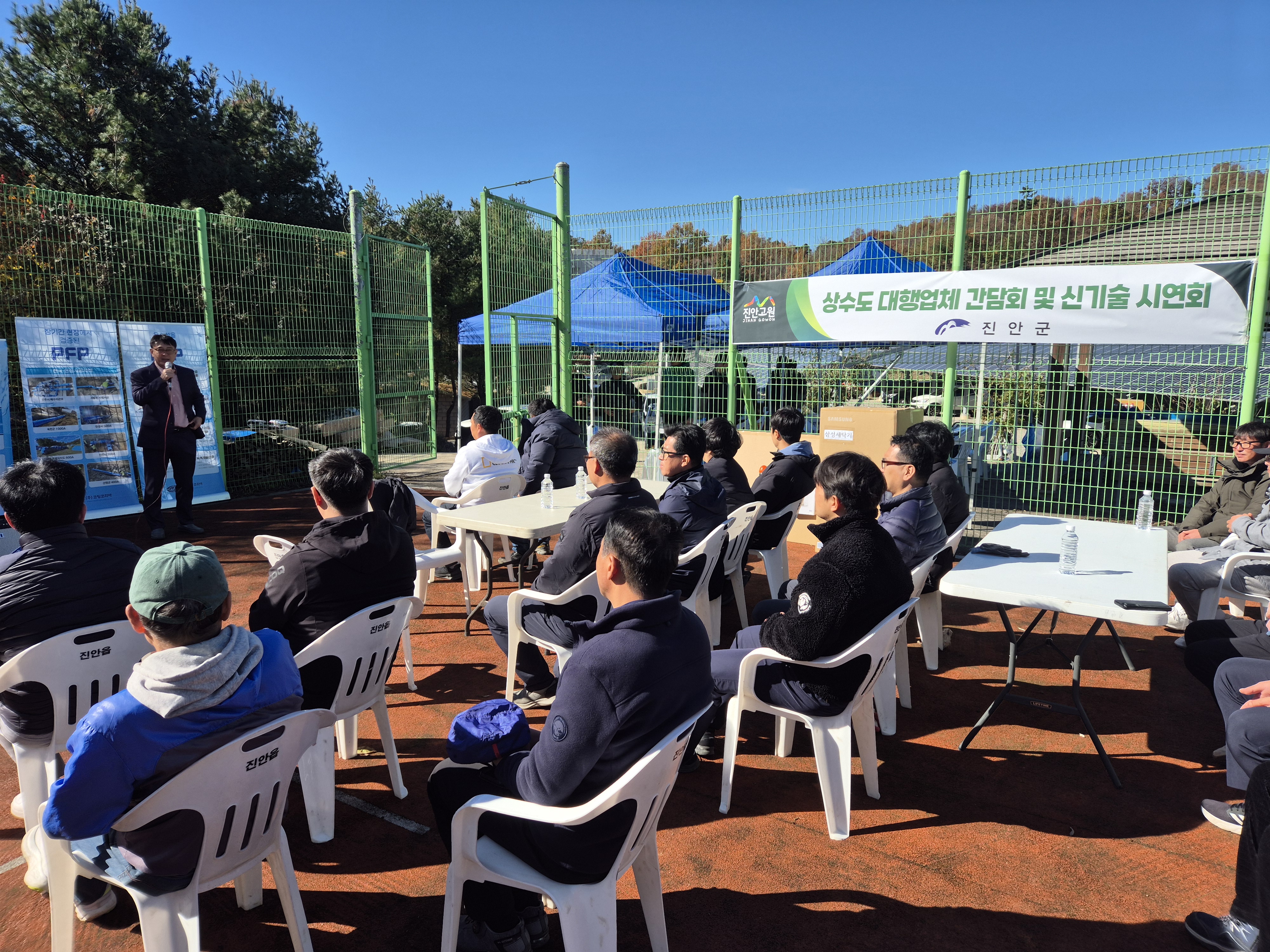 [진인=뉴전북] 진안군은 지난 11일 산약초 타운에서 관내 상하수도 대행업체 대표 및 실무자, 상하수도과 관계자 등 50여명이 참석한 가운데 ‘상하수도 대행업체 간담회 및 신기술 시연회’를 개최했다.